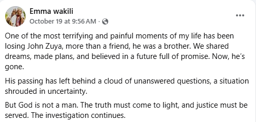 Police have arrested a friend and associate in connection with the d3ath of a traditional singer, John Zuya, popularly known as John Mai Molo in operatives in Tafawa Balewa Local Government Area of Bauchi State.  The popular Sayawa artist, whose songs had earned him fans across the country, particularly among his tribesmen, d!ed on Saturday, October 18, 2025. Zuya had recently traveled to Lagos, where he performed to a large crowd and reportedly earned a significant sum of money.  However, shortly after returning from the trip, he d!ed under mysterious circumstances, sparking shock across his community.  He was initially reported to have d!ed from food poisoning.  According to security analyst, Zagazola Makam, a few days later, Yakubu Alhamdu, Deputy Chairman of Zayoda, Tafawa Balewa branch, claimed in a video shared on his Facebook platform that Zuya was allegedly killed by his friend, Emmanuel Wakili, also a Sayawa artist.  In the video, Alhamdu stated that Wakili confessed to k!lling Zuya out of jealousy, explaining that he captured Zuyas soul (Kurwa) in a small bag and struck his head until he d!ed.  Alhamdu noted that this accounted for the blood seen on Zuyas forehead after his d3ath.  The incident has thrown the community into mourning, with many residents seeking justice.  Following the report, police traced and arrested Wakili, and investigations are ongoing to uncover the full circumstances surrounding Zuyas d3ath.  It will be recalled that the suspect, Wakil, took to Facebook to congratulate Zuya on his successful trip to Lagos.  He also confirmed Zuya's d3ath a day later.