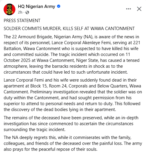 The Nigerian Army has confirmed the d3ath of a soldier, Lance Corporal Akenleye Femi, who allegedly k!lled his wife and later committed su!cide at Wawa Cantonment in Niger State. Captain Stephen Nwankwo, Acting Assistant Director Army Public Relations, 22 Armoured Brigade, Ilorin, made this known in a press statement on 12 October 2025. According to the statement, the incident occurred on October 11, 2025 at the 221 Battalion quarters within the cantonment. The statement said the bodies of the soldier and his wife were found in their apartment at Block 15, Room 24, Corporals and Below Quarters. The 22 Armourd Brigade, Nigerian Army (NA), is aware of the news in respect of its personnel, Lance Corporal Akenleye Femi, serving at 221 Battalion, Wawa Cantonment who is suspected to have k!lled his wife and committed su!cide," the statement read. "The tragic incident which occurred on 11 October 2025 at Wawa Cantonment, Niger State, has caused a tensed atmosphere, leaving the barracks residents in shock as to the circumstances that could have led to such unfortunate incident. "Lance Corporal Femi and his wife were suddenly found d3ad in their apartment at Block 15, Room 24, Corporals and Below Quarters, Wawa Cantonment. Preliminary investigation revealed that the soldier was on duty within the Cantonment, and had sought permission from his superior to attend to personal needs and return to duty. This followed the discovery of the d3ad bodies lying in their apartment. "The remains of the deceased have been preserved, while an in-depth investigation has since commenced to ascertain the circumstances surrounding the tragic incident. "The NA deeply regrets this, while it commiserates with the family, colleagues, and friends of the deceased over the painful loss. The army also prays for the peaceful repose of their souls. "The Commander 22 Armoured Brigade, Brigadier General Ezra Barkins, assures the general public that the circumstances that led to the sad incident will be thoroughly investigated, and the outcome relayed to the general public accordingly. The NA anticipates maximum understanding and cooperation of the public as always, assuring that the outcome of the investigation will not only be made public, rather, further scrutinised, and measures put in place to avoid future occurrences.