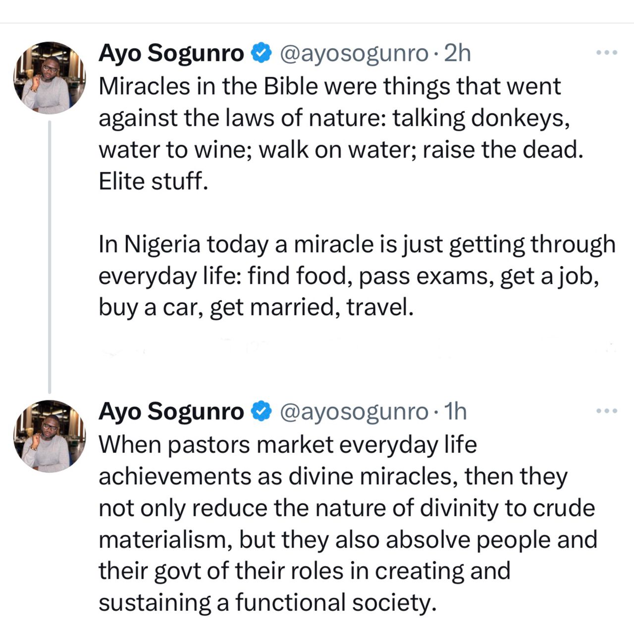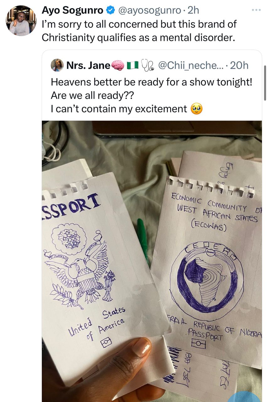 Nigerian lawyer, Ayo Sogunro, says the brand of Christianity where Christians are expected to dress like your miracle'' should qualify as a mental disorder. Sogunro shared this opinion on his X handle today October 22, while expressing his disdain at the dress like your miracle' service conducted by popular minister, Nathaniel Bassey. During the virtual service, participants are expected to dress like the miracle they are praying for. Women who are seeking to get married dress up in bridal attires, women trying to conceive carry dolls on their back amongst many others. Last night, a Nigerian drew photos of the American passport and prayed that by this time next year, he would have become a citizen of the US and obtained his US passport, Reacting to the post, Sogunro who appears not to believe in such miracles, wrote;Im sorry to all concerned but this brand of Christianity qualifies as a mental disorder.''