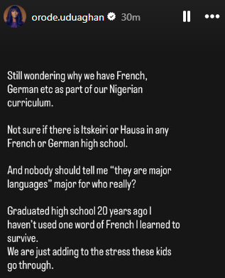 Orode Uduaghan, the daughter of former Delta State Governor, Emmanuel Uduaghan, has questioned the relevance of foreign languages like French and German languages in the Nigerian school curriculum. Orode, who is the Delta State Commissioner for Humanitarian Affairs, Community Support Services and Girl Child Development, said she has never used one word of French she learnt since she graduated high school 20 years ago. Still wondering why we have French, German etc as part of our Nigerian curriculum, she wrote in her Instagram story on Monday, October 13. Not sure if there is Itsekiri or Hausa in any French or German high school. And nobody should tell me they are 'major languages' Major languages for who? "Graduated high school 20 years ago and I haven't used one word of French I learned to survive. We are just adding to the stress these kids go through," she added. Recall that the Federal Government recently approved the introduction of the Chinese language into the Senior Secondary School curriculum.