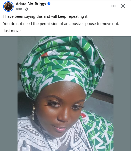Nigerian lawyer and the immediate past Chairperson of International Federation of Women Lawyers (FIDA) Nigeria, Rivers State Branch, Adata Bio-Briggs, has advised people to leave their abusive spouses stating that they dont need any permission. She stated this in a Facebook post on Sunday. I have been saying this and will keep repeating it. You do not need the permission of an abusive spouse to move out. Just move, she wrote.
