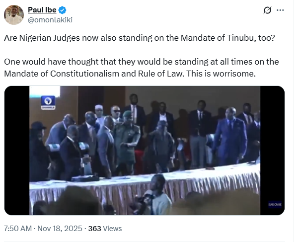 The media aide to former Vice President Atiku Abubakar, Paul Ibe, has slammed the Nigerian judiciary for allowing President Tinubus supporters anthem On your mandate we shall stand be played at the All Nigerian Judges conference  President Tinubu had attended the event as a special guest of honor. Shortly before he was to mount the podium to give his speech, the music band began playing the supporter's anthem On your mandate we shall stand''. Paul who shared the video online, kicked against this move. Are Nigerian Judges now also standing on the Mandate of Tinubu, too? One would have thought that they would be standing at all times on the Mandate of Constitutionalism and Rule of Law. This is worrisome.''Watch the video below