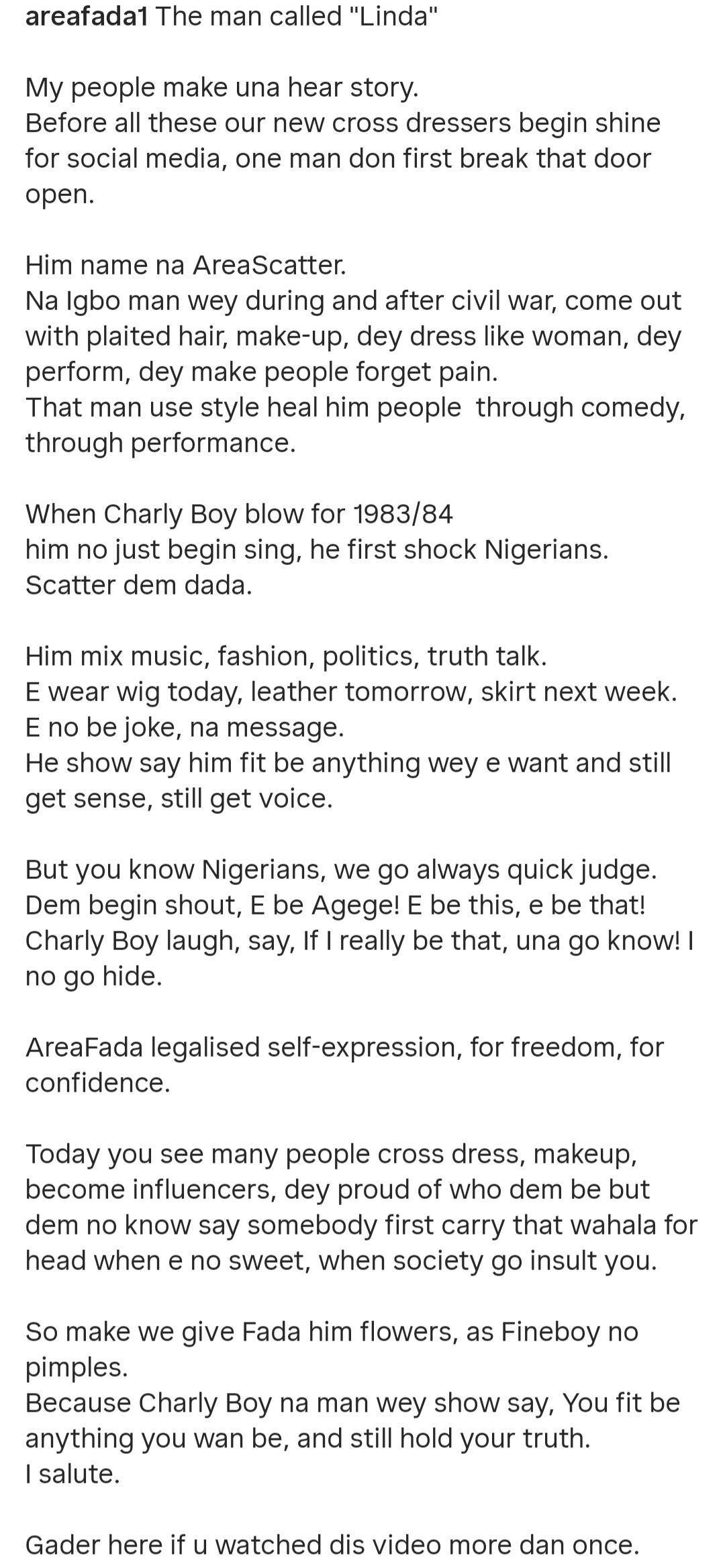 Charley Boy, aka Area Fada, has said he paved the way for cross dressers to express themselves in Nigeria. The entertainer, whose real name is Charles Oputa, shared a video of himself wearing makeup and acting feminine. He introduced his character as his alter ego "Linda". In the caption, he wrote: "The man called 'Linda'. "My people make una hear story. Before all these our new cross dressers begin shine for social media, one man don first break that door open. "Him name na AreaScatter. Na Igbo man wey during and after civil war, come out with plaited hair, make-up, dey dress like woman, dey perform, dey make people forget pain. "That man use style heal him people through comedy, through performance. "When Charly Boy blow for 1983/84 him no just begin sing, he first shock Nigerians. Scatter dem dada. "Him mix music, fashion, politics, truth talk. E wear wig today, leather tomorrow, skirt next week. "E no be joke, na message. He show say him fit be anything wey e want and still get sense, still get voice. "But you know Nigerians, we go always quick judge. "Dem begin shout, E be Agege! E be this, e be that! "Charly Boy laugh, say, If I really be that, una go know! I no go hide. "AreaFada legalised self-expression, for freedom, for confidence. "Today you see many people cross dress, makeup, become influencers, dey proud of who dem be but dem no know say somebody first carry that wahala for head when e no sweet, when society go insult you. "So make we give Fada him flowers, as Fineboy no pimples. Because Charly Boy na man wey show say, You fit be anything you wan be, and still hold your truth. I salute.