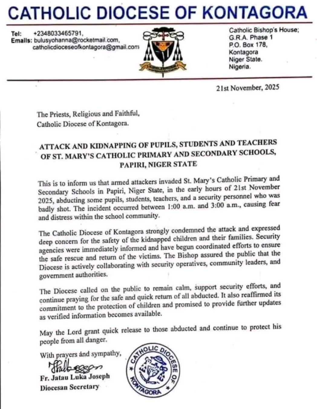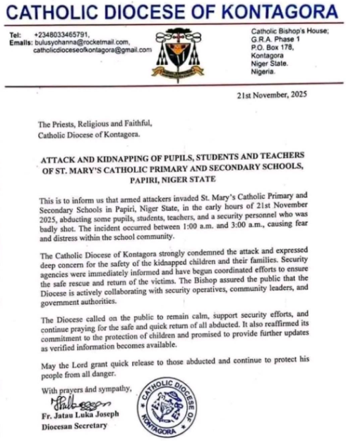 The Catholic Diocese of Kontagora has confirmed that armed attackers invaded St. Marys Catholic Primary and Secondary Schools in Papiri, Agwara Local Government Area of Niger State, in the early hours of November 21, 2025, abducting pupils, students, teachers, and a security guard. According to a statement signed by the Diocesan Secretary, Fr. Jatau Luka Joseph, the attack happened between 1:00 a.m. and 3:00 a.m., causing fear and distress within the school community. Fr. Luka also disclosed that a security personnel was badly shot during the incident. The Diocese of Kontagora strongly condemned the attack and expressed deep concern for the safety of the kidnapped children and their families. Security agencies were immediately informed and have coordinated efforts to ensure the safe rescue and return of victims. The Bishop assured the public that the Diocese is actively collaborating with security operatives, community leaders and government authorities, the statement read. The Diocese called on the public to remain calm, support security efforts, and continue praying for the safe and quick return of all abducted." The Diocese added that it will provide more updates as verified information becomes available. May the Lord grant quick release to those abducted and continue to protect his people from all danger," the statement concluded.
