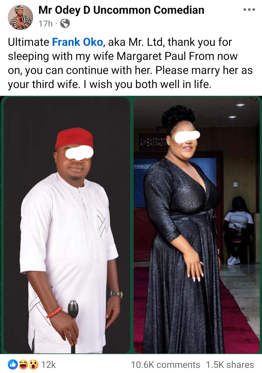 A comedian is trending on Faceboo after he called out his wife and the man's she's allegedly cheating on him with. The comedian, known as Mr Odey D Uncommon, took to Facebook to share a photo of his wife and her alleged lover whom he named as Mr Frank Oko. He even went as far as tagging the man. In the caption, the comedian wrote: "Ultimate Frank Oko, aka Mr. Ltd, thank you for sleeping with my wife Margaret Paul From now on, you can continue with her. Please marry her as your third wife. I wish you both well in life."
