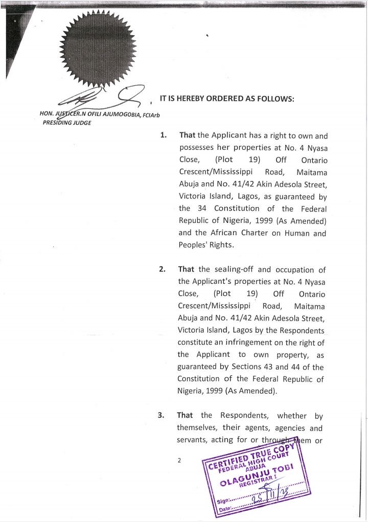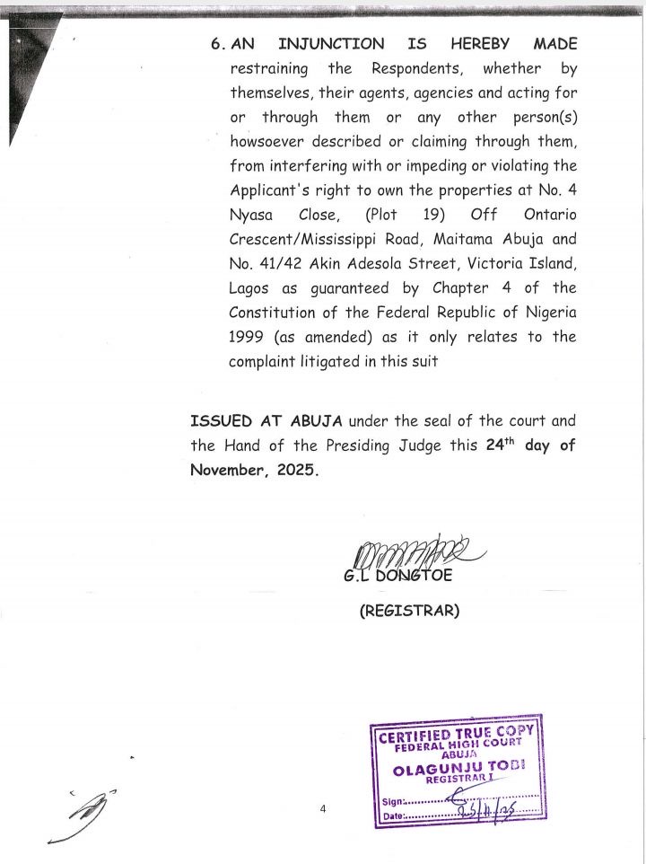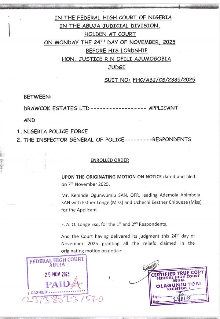 Read the statement bu Drawcok Estate belowA Federal High Court sitting in Abuja has ordered the Nigerian Police Force as well as the Inspector-General of Police, Mr. Kayode Egbetokun not to go near the building which occupies Nestoil Group on No. 41/42 Akin Ademola Street, Victoria Island in Lagos State as it belongs to Drawcok Estates LTD.Drawcok Estates LTD had on November 7, 2025 through Mr. Kehinde Ogunwumiu, SAN, Ademola Abimbola, SAN with Esther Longe and Uchechi Chibueze prayed to the court to order the Nigerian Police Force and the IGP who are the first and second respondents not to interfere with or impend or violate her (applicant) right to own the properties on No. 4 Nyasa close, plot 19, Off Ontaria crescent /Mississippi road, Maitama Abuja and 41/42 Akin Adesola Street, Victoria Island, Lagos State as guarantees by the chapter 4 of the Constitution of the Federal Republic of Nigeria 1999 as amended as it only relates to the complaint litigated in the suit. Delivering the judgement in suit number FHC/ABJ/CS/2385/2025 on November 24, 2025, the presiding judge, Honourable Justice R.N. Ofili Ajumogobia ruled that that the applicant has a right to own and possess her properties as mentioned in the addresses above as guaranteed by the 34 Constitution of the Federal Republic of Nigeria, 1999 as amended and the African Charter on Human and Peoples Rights. Justice Ajumogobia stressed further in her ruling that the sealing-off and occupation of the applicants properties on the addresses mentioned above by the Respondents constitute an infringement on the right of the applicant to own property, as guaranteed by Sections 43 and 44 of the he Constitution of the Federal Republic of Nigeria, 1999 as amended.The judge also ruled that the Respondents, whether by themselves , their agents, agencies and servants, acting for it through them or any other person(s) howsoever described or claiming through them, to vacate the applicants properties on the addresses mentioned above, and deliver possession over to the applicant forthwith.Ajumogobia stressed that the Respondents, whether by themselves, their agents, agencies, and servants, acting for or through them or any other person(s) howsoever described or claiming through them, to provide security for the applicant to take back possession of her properties on the addresses mentioned above.She also gave an order that the Respondents is restrain, whether by themselves, their agents, agencies and servants, acting for or through them or any other person(s) howsoever described or claiming through them, from harassing the applicant and refusing her access to her properties on the addresses mentioned above.