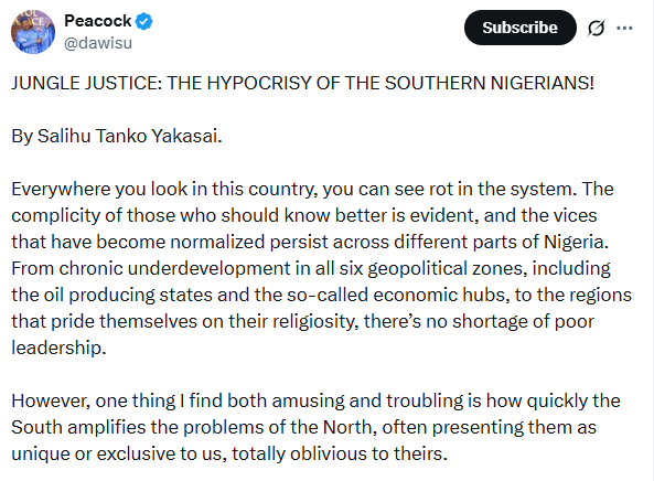 Former Kano state governorship candidate, Salihu Tanko-Yakassai, has berated Nigerians from the Southern region who are quick to condemn the North over reported acts of v!olence such as the mob k!lling of student Deborah Samuel while forgetting to raise their voices over the several acts of jungle justice carried out in the South. He said instead of Nigerians to jointly condemn acts of v!olence, Southern Nigerians have made it a habit to condemn the entire North when an act of v!olence is report and never do the same thing when jungle justice is reported in their region. According to him, jungle justice is predominant in the South and but this does not make the Northerners paint the entrire South as a bad region whenever such acts of v!olence is recorded. He argued that the South should stop with this hypocrisy and learn to condemn an act of v!olence and not the region where it happens. Read his piece belowUNGLE JUSTICE: THE HYPOCRISY OF THE SOUTHERN NIGERIANS! By Salihu Tanko Yakasai. Everywhere you look in this country, you can see rot in the system. The complicity of those who should know better is evident, and the vices that have become normalized persist across different parts of Nigeria. From chronic underdevelopment in all six geopolitical zones, including the oil producing states and the so-called economic hubs, to the regions that pride themselves on their religiosity, theres no shortage of poor leadership. However, one thing I find both amusing and troubling is how quickly the South amplifies the problems of the North, often presenting them as unique or exclusive to us, totally oblivious to theirs. For clarity, I am not excusing the North. I have addressed our issues many times, particularly regarding insecurity. In fact, some readers may recall that I was arrested by the DSS in 2021 during the administration of late President Buhari after I criticized the handling of the Tegina schoolgirls abduction. I have also written openly about the failures of northern leaders, including my 2012 article, "19 Northern Governors: The Certified Parasites." I have consistently urged youngnortherners to build capacity and equip themselves to add value to Arewa and the country as a whole. Yes, we have been vocal in our criticisms and have held our leaders accountable. What I rarely see happen, is that same objectivity from many in the South. Whenever something occurs in the North, they swiftly condemn all northerners collectively, presenting it as if the entire region is guilty or that such acts are widespread and culturally accepted. Take jungle justice as an example. The killing of Deborah in Sokoto is often cited as a favorite reference point by Nigerians from the South. For the record, my position has always been clear: Deborah should have been handed over to the authorities if she committed any crime. No one has the right to pass judgment outside the law. Her killing was jungle justice, plain and simple. Does that mean blasphemy is condoned? Absolutely not. But it should be the courts, not a mob, that decides. However, heres the hypocrisy: that same jungle justice is also widespread in the South. Burning people alive with tires, stoning them, or using cutlass to unailve them is rampant all over the South. Many high-profile killings of northerners have occurred there in recent years. Harira Jubril and her four daughters were murdered in Anambra in 2022 by suspected ESN operatives. Sixteen northerners were lynched and burned in Uromi, Edo State, in 2025. The violence at Sasa market in Ibadan in 2021 left many Hausa residents dead and displaced. In the same year, armed separatists shot dead northern traders in Orlu and Umuaka, Imo State. These are not rumors; these are facts. Yet, somehow, these incidents are downplayed or ignored. When you mention them, some people respond by saying Deborah was killed in the name of Islam, as if that magically makes the killing of northerners acceptable merely because itwasnt done in the name of Christianity, even though the perpetrators were Christians. Even in the Southwest, where many present themselves as morally superior, the jungle justice carried out by the Oodua Peoples Congress (OPC) is conveniently forgotten. OPC began as a rights group but quickly morphed into a vigilante outfit linked to violent clashes across Lagos in the late 90s and early 2000s. Human Rights Watch documented killings ranging from beheadings, torture, arson, and ethnic attacks in areas such as Ketu, Mile 12, Ajegunle, Idi-Araba, Ojo, and Isolo. Northern traders, civilians, and even policeofficers were victims, with official estimates of the death toll nearing 500. Yet this history rarely makes its way into their moral lectures. Curiously, their memory seems to begin and end with Deborah or similar acts in the North. The common denominator in all these examples is clear: jungle justice. It is neither northern nor southern; it is a Nigerian problem. This selective outrage is not only hypocritical; it is dangerous. If we genuinely want a better country, we must condemn evil wherever it arises, not just when it suits our regional ego. Jungle justice thrives on emotion, ignorance, and collective cowardice. It destroys trust, erodes justice, and turns ordinary people into executioners. Until we confront this truth honestly, without hypocrisy or selective morality, we will continue to dance in circles, pretending that one part of Nigeria is holier than the other. The reality is that jungle justice thrives everywhere in Nigeria for the same reason: people no longer trust the justice system to protect them or punish offenders. And as the saying goes, once you allow the mob to decide who lives or dies, no oneis safe, not even the mob!''