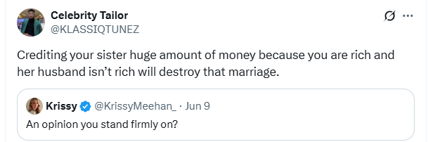 A Nigerian tailor has said that if a rich person gives his married sister a huge amount of money, her marriage will be destroyed. Crediting your sister huge amount of money because you are rich and her husband isnt rich will destroy that marriage, he wrote.