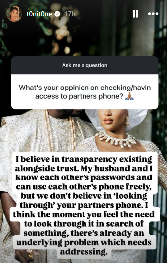 British-Nigerian author Toni Tone has revealed that she and her husband have full access to each other's phones. Toni and her husband, Taye, got married in September 2025. The writer, who disclosed this during a question and answer session with her followers on Wednesday, November 19, said she believes in transparency alongside building trust. She, however said looking through a partner's phone in search of something indicates an underlying problem that needs to be addressed.