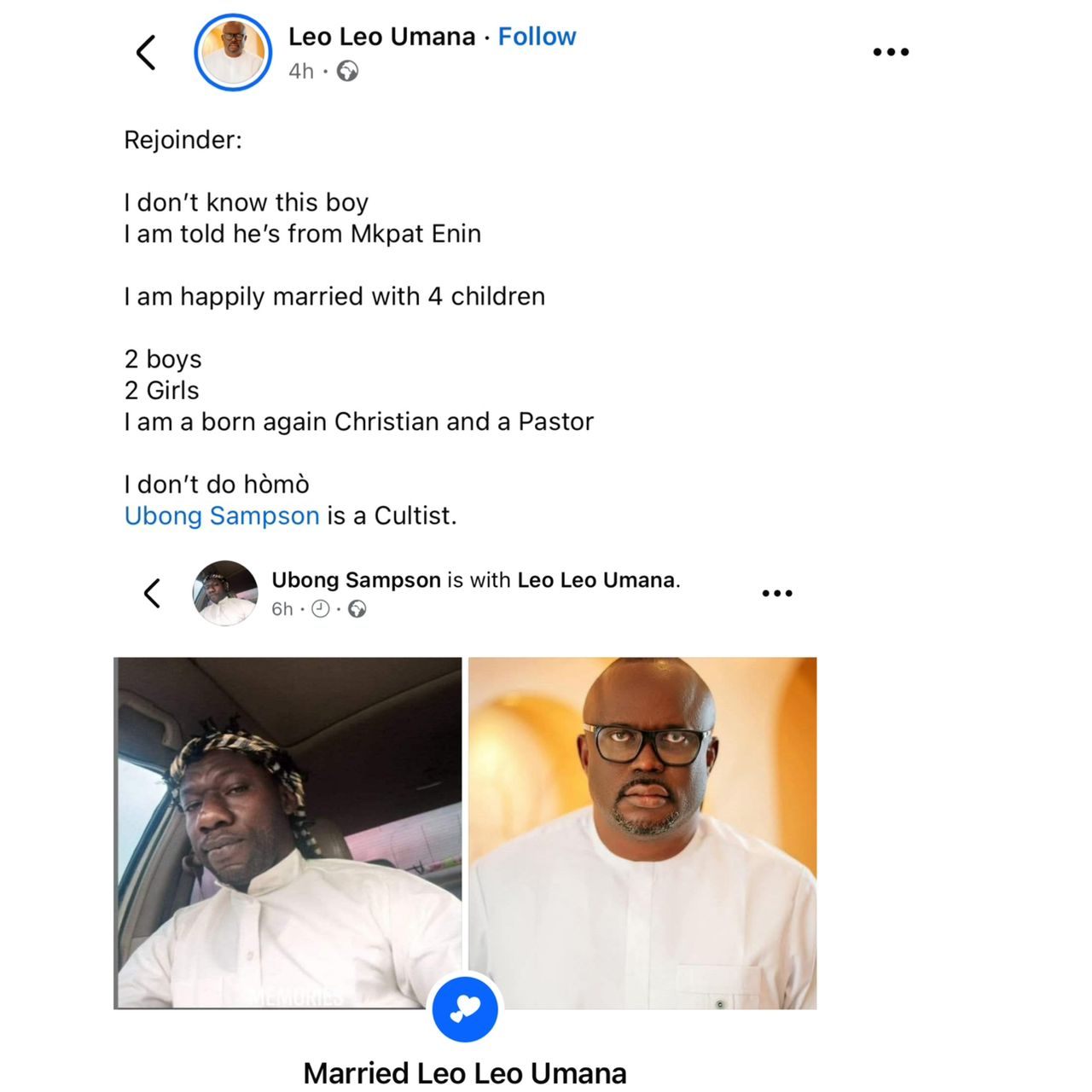 Leo Leo Umana, a married Nigerian father of four, has taken to his Facebook account to publicly deny claims by another man who went online to suggest they were in a romantic relationship. The controversy began when a young man identified as Ubong Sampson made a post on his Facebook page, implying that he and Mr. Umana are married. The post quickly circulated, prompting Umana to issue a swift rebuttal. In a strongly worded rejoinder, Umana distanced himself from the claim and reaffirmed his marital status and religious identity. He wrote: Rejoinder:I dont know this boyI am told hes from Mkpat EninI am happily married with 4 children2 boys2 GirlsI am a born-again Christian and a PastorI dont do hmUbong Sampson is a Cultist.