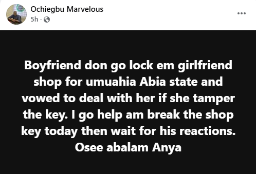 A yet-to-be identified man locked up his girlfriend's shop in Umuahia, Abia State and threatened to deal with her if she tampered with the key. Human rights activist, Ochiegbu Marvelous, who confirmed the incident on Monday, November 34, 2025, led his team to the scene and broke the key. Ochiegbu didn't disclose the reason for the man's action at the time of filing this report. He however said the man has no right to lock the shop because the rent receipt and other documents are in the woman's name. Boyfriend don go lock em girlfriend shop for umuahia Abia state and vowed to deal with her if she tamper the key. I go help am break the shop key today then wait for his reactions. Osee abalam Anya, he wrote. Shop successfully opened. We are waiting for his next line of action. He dont have any right to lock her shop. No justifiable reason at all. Some men should learn ooooo. Osee abalam Anya!! Uwam. Shop rent and other receipts bears the lady name. So wetin una want tell me, he added in an update.