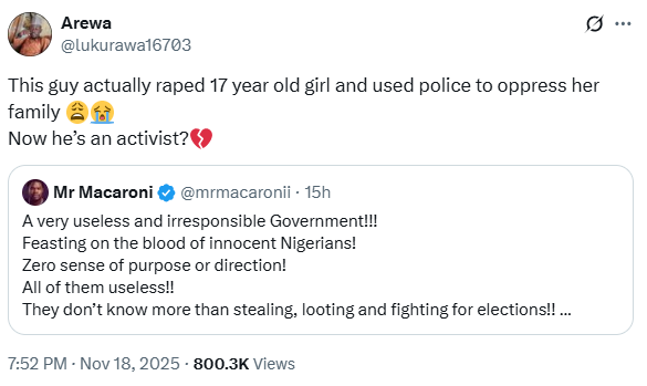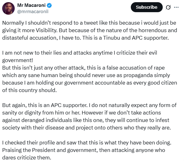 Activist and actor, Adebowale Adedayo aka Mr Macaroni, has vowed to taken legal action against an X user who he says is a supporter of the APC after making unfounded claims against him.The X-user had accused him of sexu@lly v!olating a 17 year old girl many years ago and using the police to oppress the family of the victim.