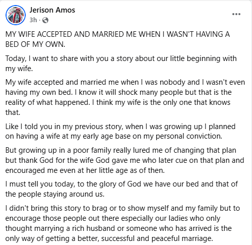 A Nigerian man, Jerison Amos, has revealed that his wife accepted and married him when he didn't even have a bed to sleep on.  Amos, who shared his story in a Facebook post on Friday, November 28, 2025 said he had always planned on getting married early though he grew up in a poor family.  According to him, he shared his story to encourage young men who are scared of getting married because of financial constraints.   Addressing ladies, he said marrying a rich man is not the only key to a successful and peaceful marriage. Today, I want to share with you a story about our little beginning with my wife. My wife accepted and married me when I was nobody and I wasn't even having my own bed. I know it will shock many people but that is the reality of what happened. I think my wife is the only one that knows that, he wrote. Like I told you in my previous story, when I was growing up I planned on having a wife at my early age base on my personal conviction. But growing up in a poor family really lured me of changing that plan but thank God for the wife God gave me who later cue on that plan and encouraged me even at her little age as of then. I must tell you today, to the glory of God we have our bed and that of the people staying around us. I didn't bring this story to brag or to show myself and my family but to encourage those people out there especially our ladies who only thought marrying a rich husband or someone who has arrived is the only way of getting a better, successful and peaceful marriage. I want my story to teach the young men who are scared of getting married because of their current financial constraints that if you are determined and willing to share your ideas with your partner you can definitely become who you wish to be together.