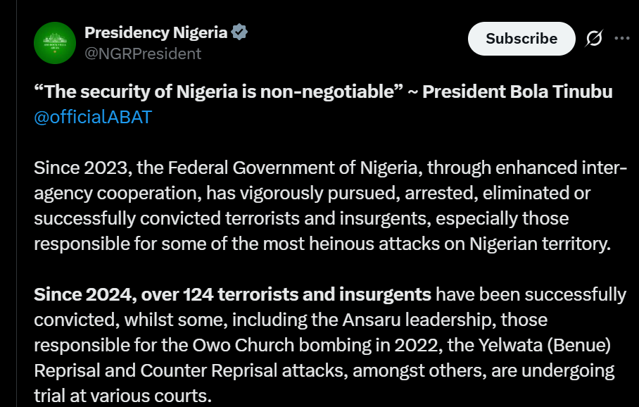Nigeria has recorded an 81 percent drop in terror-related deaths since 2015, the Presidency said on Sunday, November 9. crediting the decline to stepped-up counter-insurgency operations and tighter cooperation between security agencies and affected communities. In its statement posted on X, the Presidency added that more than 13,000 terrorists have been neutralised in the past year, while over 124,000 fighters and their dependents have surrendered to authorities. It also said more than 2.1 million internally displaced people have returned to their homes as communities in previously ravaged areas are rebuilt and normal life slowly returns. According to the Presidency, the Federal Government has set up a Resettlement Scheme for people impacted by conflict, aimed at rebuilding destroyed communities and helping displaced citizens reintegrate. It added that since 2023, enhanced inter-agency cooperation has led to the arrest, elimination, or successful conviction of terrorists and insurgents behind some of the deadliest attacks in the country. More than 124 terrorists have been convicted since 2024, while others including members of the Ansaru leadership and suspects linked to the 2022 Owo church bombing and the Yelwata reprisal attacks in Benue are currently facing trial. The statement also highlighted ongoing efforts such as joint security task forces, reinforced border patrols with local and regional partners, compensation for victims, permanent joint patrols, and intelligence sharing with international allies to further protect Nigerians and strengthen national security.
