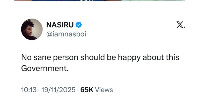 Comedian Nasboi has voiced his frustration with the state of the country, saying no sane person should feel satisfied with the current government. The entertainer shared the blunt remark on X, where it quickly gained traction and drew reactions from Nigerians who echoed similar sentiments about hardship, insecurity and governance challenges. See his tweet below