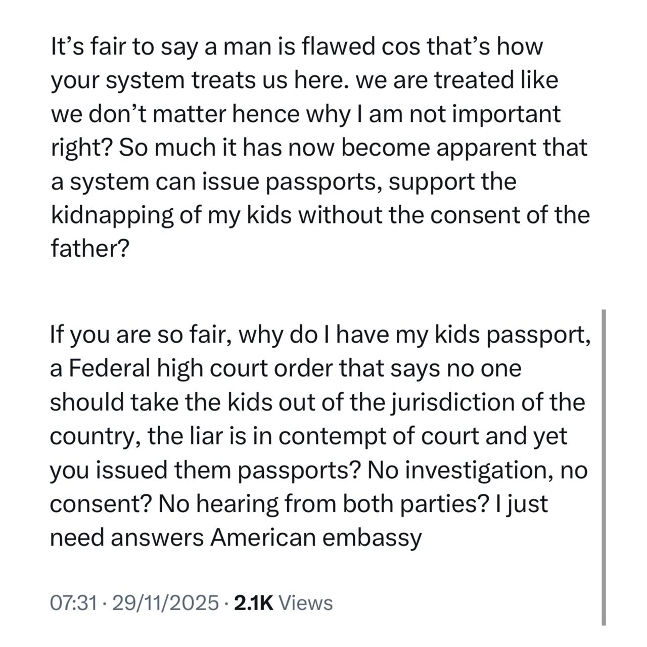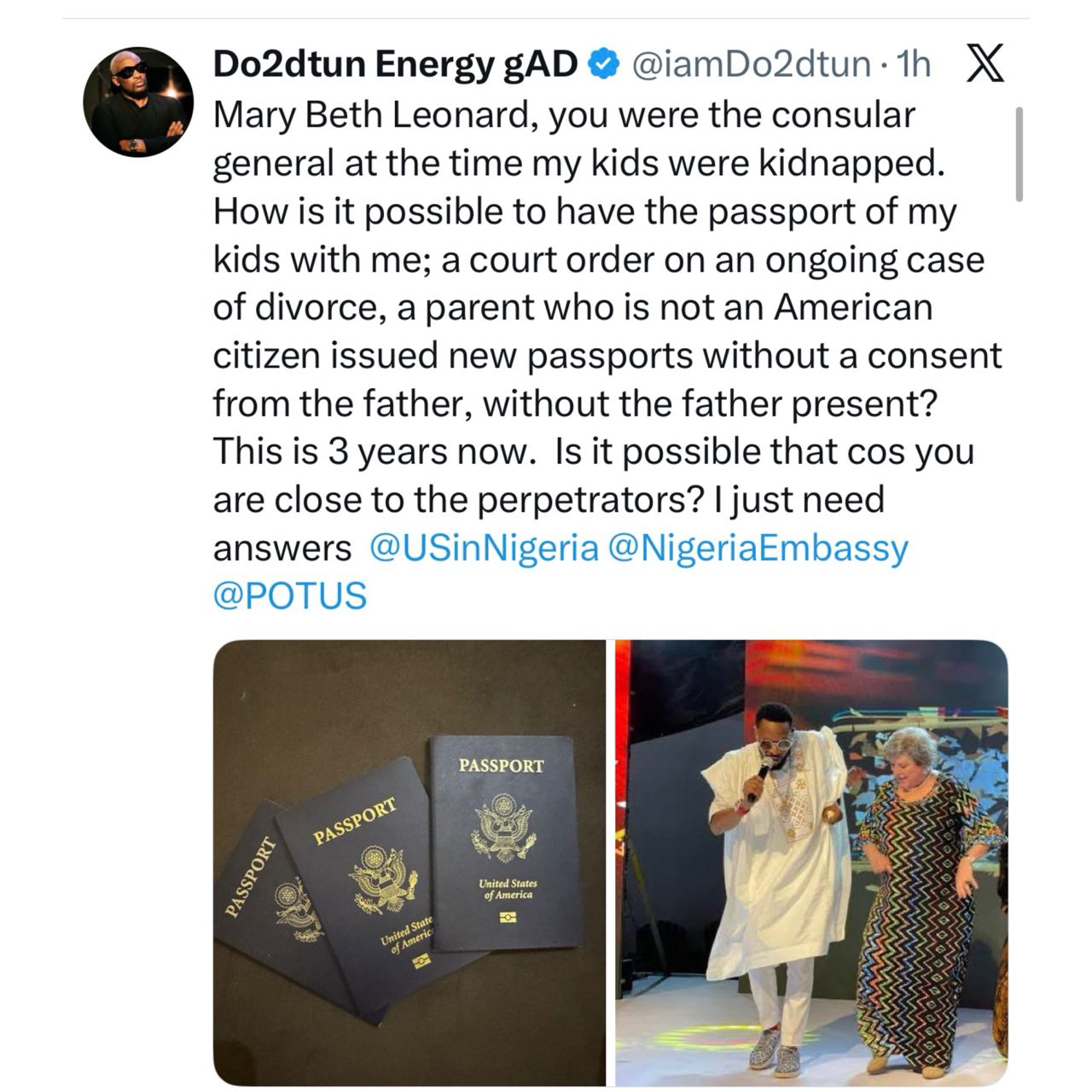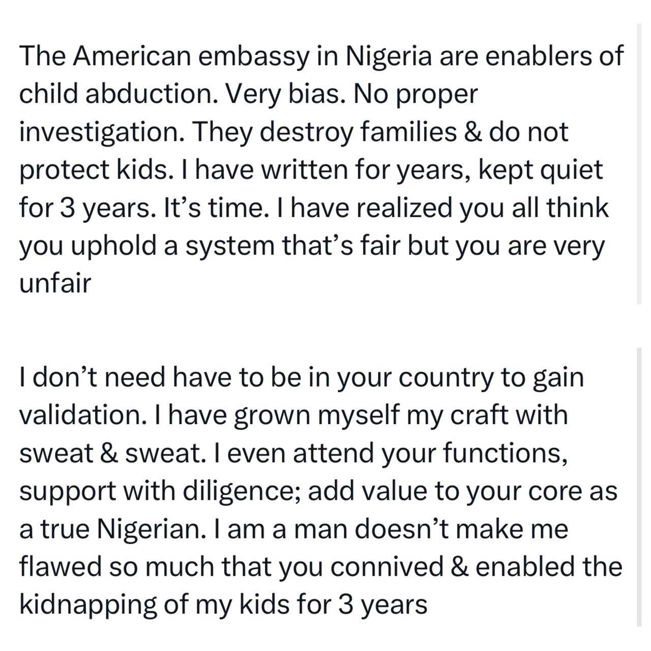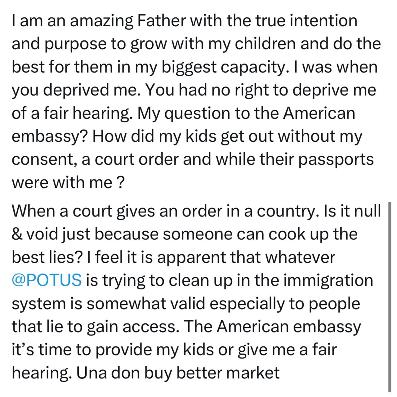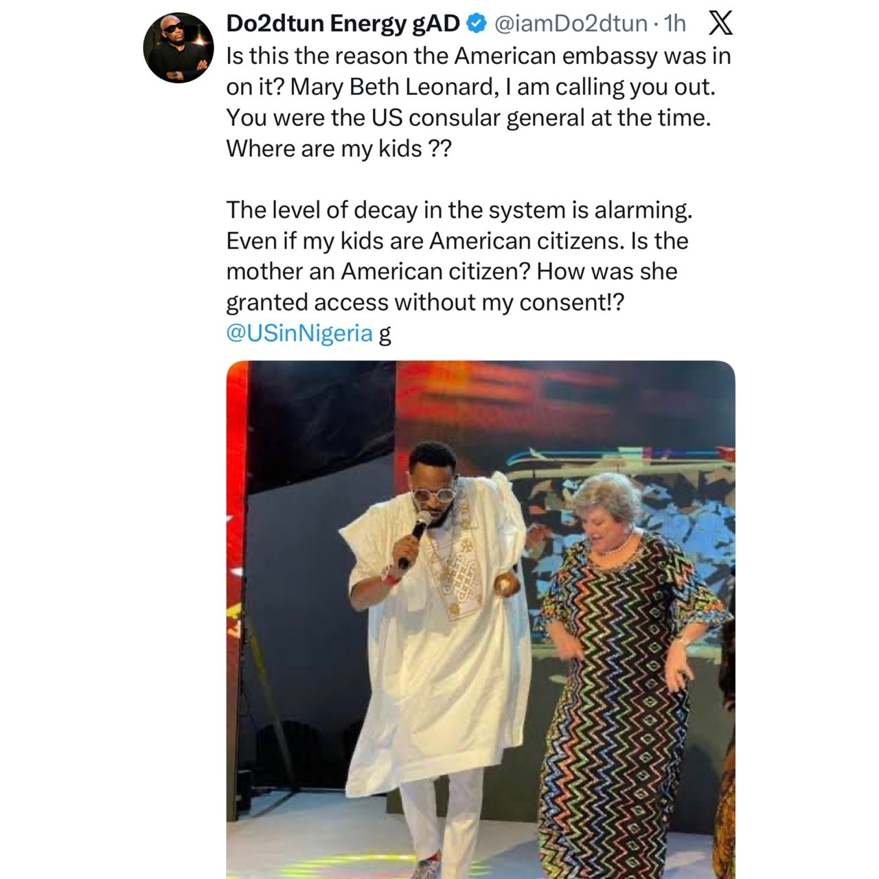 OAP Dotun has taken to social media to call out the American Embassy in Nigeria for allowing his ex-wife, Taiwo Oyebanjo, relocate to the US with their children without his consent. Dotun and Taiwo were married for eight years until they went their separate ways and have been battling for the custody of their two girls. Dotun has repeatedly called out Taiwo, her family and Taiwo's older brother, singer DBanj, for allegedly denying him access to their children despite court orders for a joint custody. In a series of posts shared on social media this morning, Dotun accused the US Embassy in Nigeria of conniving with Taiwo to relocate their daughters to the US without his consent. He also called out the former US Consulate to Nigeria for allegedly conniving with Taiwo and her family to take his kids out Nigeria without his consent. See his post below