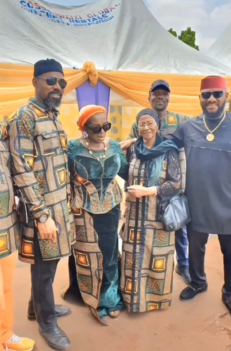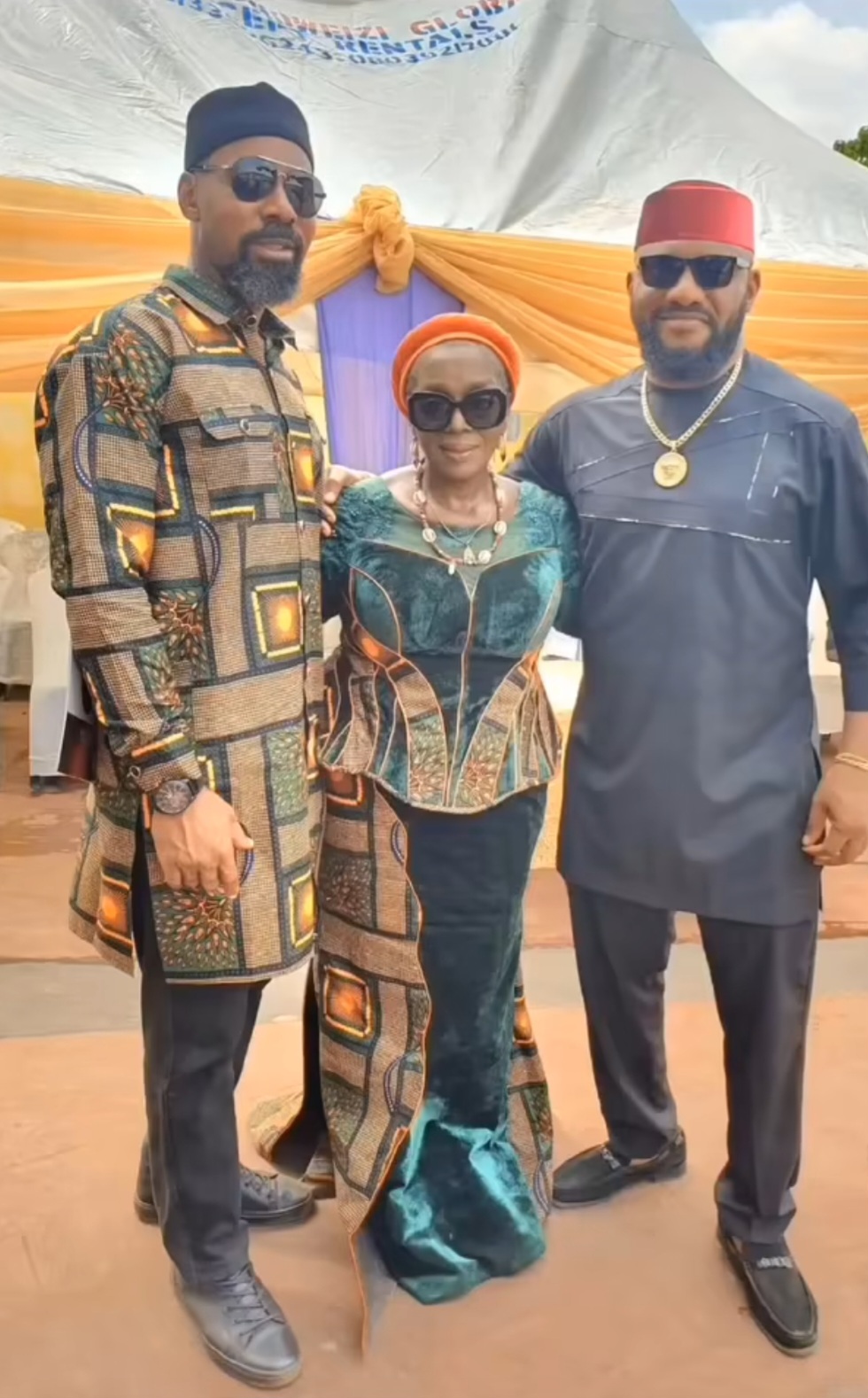 Rita Edochie and her husbands nephews Linc Edochie and Yul Edochie have prove that family will always stand together, no matter what. The actress has been vehemently calling out Yul's wife Judy Austin and also Linc's former fiance Yinka Theisen. Rita made it clear that she stands by Yul's estranged wife May Edochie and doesn't support Judy who got pregnant for Yul and became his wife. She has also constantly dragged Yinka Theisen for coming into Linc's life only to take sides with Judy and call out May. At a recent event attended by members of the Edochie family, Rita is seen playfully greeting Linc and Yul. Both men treated her with love and respect, making it clear that they still respect her as their uncle's wife. Rita is seen whispering to Yul something about how far she has gone on his behalf. "Do I know how far you've gone?" Yul responded, laughing with her. "Do I know your way?" Yul also said to his aunt in-law. Both men later posed with their Rita and their mother.
