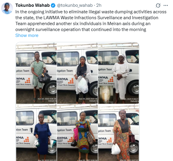 The Lagos state Commissioner for Environment and Water Resources, Tokunbo Wahab, has confirmed the arrest of six individuals in the Meiran axis of the state for illegal dumping of refuse on Thursday, November 20. He gave the names of the apprehended individuals as Patience Orobatan 72 (female), 2. Felicia Aja 40 (female), Sheriff Ogundeji 20 (male), Titilayo Durorike 40 (female) , Adeola Ononuga 52 (female) and Adu Bola 60 (female). Following their apprehension, all individuals were investigated to determine the reasons for their disposal of waste in unauthorized locations. None of the individuals was able to provide evidence of PSP registration or demonstrate the existence of a waste storage facility at their residential premises. All apprehended individuals have been transferred to the LAWMA legal team at the Oshodi Taskforce office for further legal proceedings.