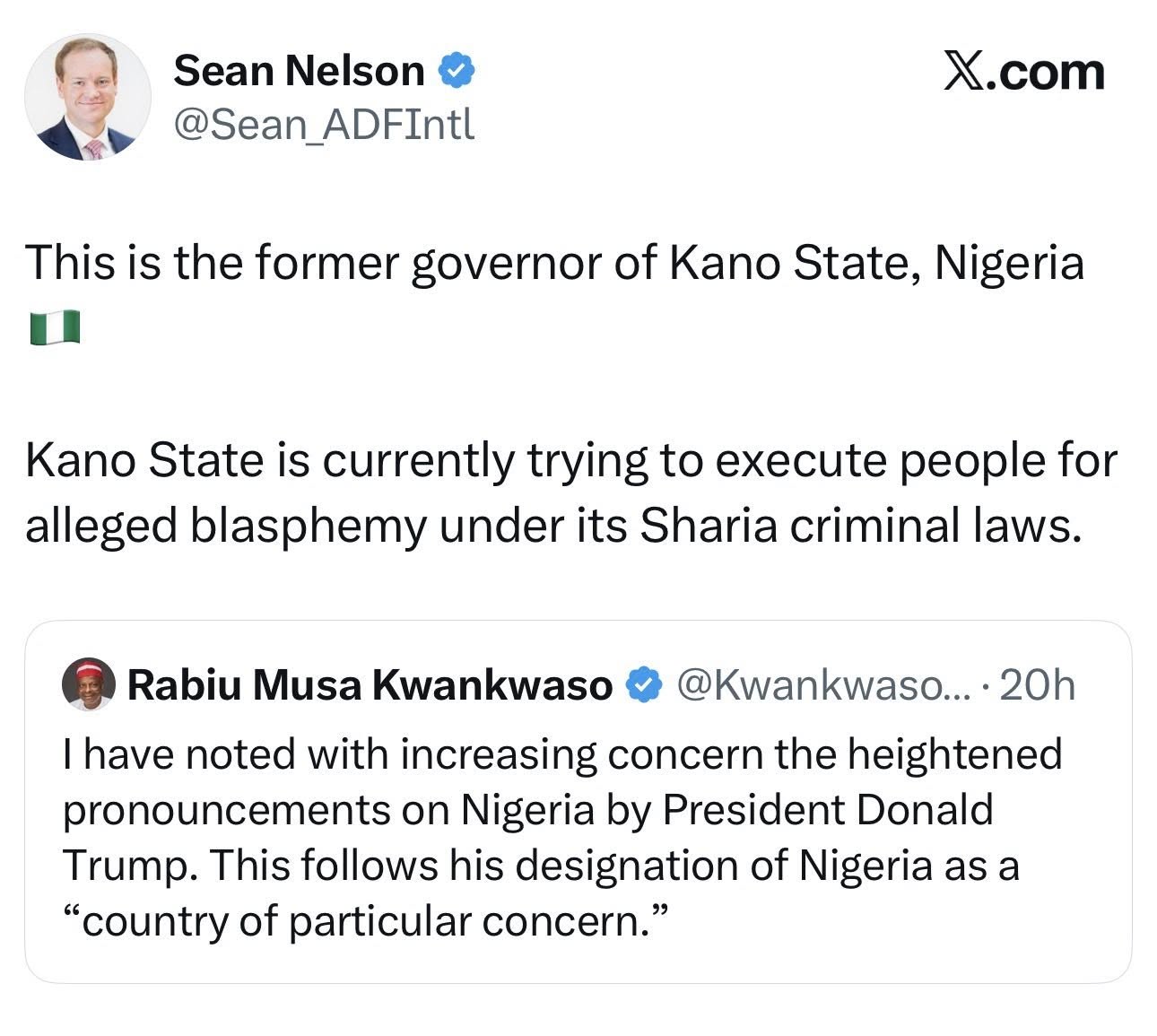 Senior Counsel at Global Religious Freedom, Sean Nelson, has called out former Kano State governor and New Nigeria Peoples Party (NNPP) leader, Rabiu Musa Kwankwaso, following the latters statement addressing former U.S. President Donald Trumps recent remarks about Nigeria. Kwankwaso had issued a statement on his verified X page expressing concern over Trumps heightened pronouncements and designation of Nigeria as a country of particular concern. In his message, he urged diplomatic engagement over confrontation and emphasized that insecurity in Nigeria does not distinguish based on religious, ethnic, or political beliefs. It is important to emphasise that our country is a sovereign nation whose people face different threats from outlaws across the country. The insecurity we face does not distinguish based on religious, ethnic, or political beliefs, Kwankwaso said. The United States should assist the Nigerian authorities with better cutting-edge technology to tackle these problems, rather than posing a threat that could further polarise our country. Kwankwaso also advised the Nigerian government to strengthen its diplomatic presence by appointing special envoys and permanent ambassadors to engage Washington and other global partners. However, Sean Nelson reacted critically to the statement, questioning Kwankwasos moral authority to speak on religious tolerance. Quoting the former governors post, Nelson wrote: This is the former governor of Kano State, Nigeria . Kano State is currently trying to execute people for alleged blasphemy under its Sharia criminal laws.