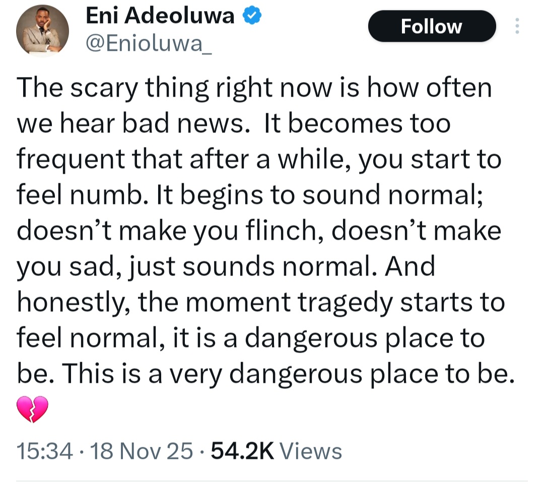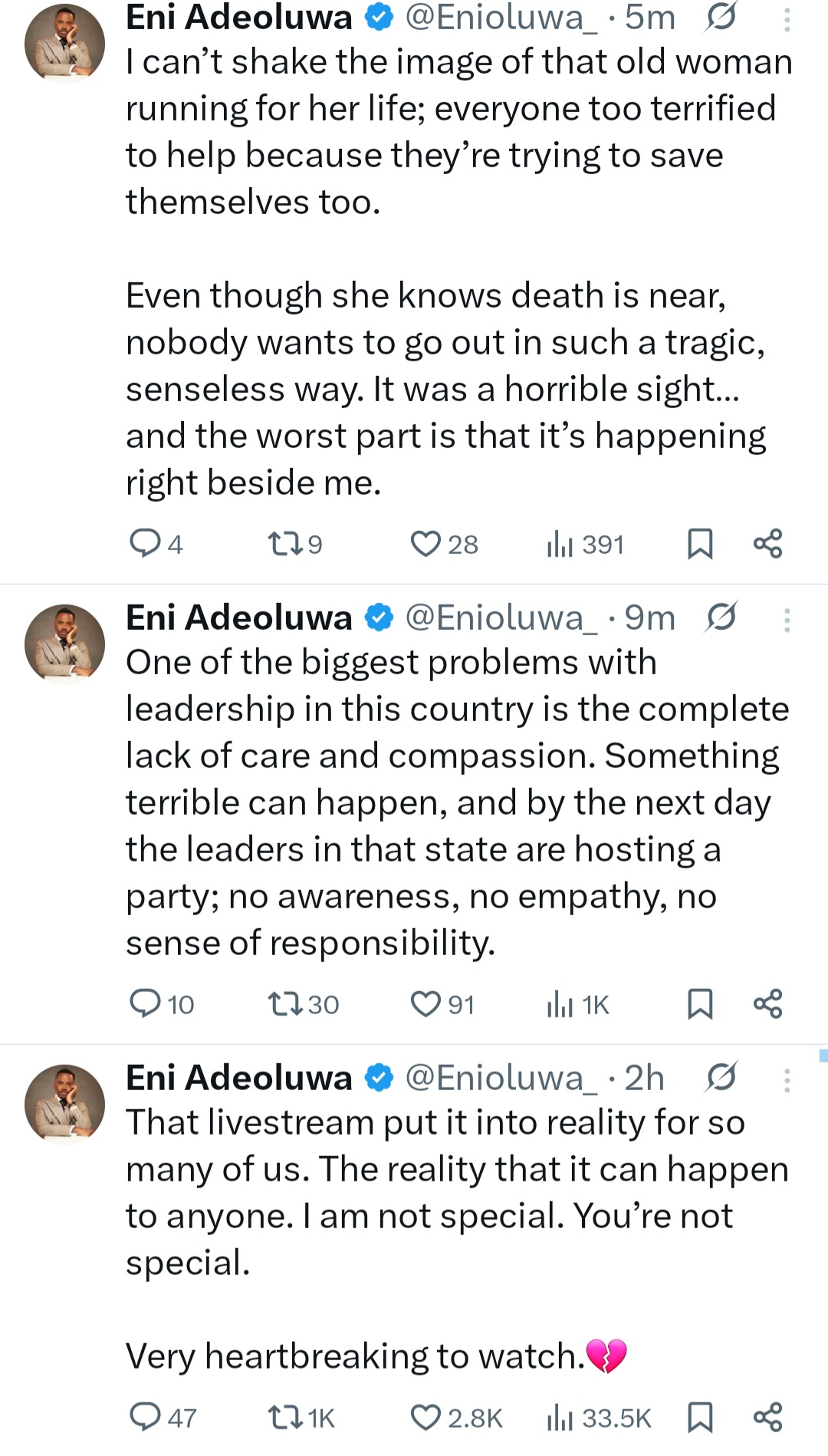 Enioluwa has condemned Nigerian leaders for their nonchalant attitude towards the k!llings in the country. The influencer took to Twitter to express concern after a Church was attacked by gunmen in Kwara state and a livestream captured panicked members running for their lives amid the attack. Reacting, Eni revealed that the video showed the reality that anyone can become a victim of the insecurity in Nigeria. In another tweet, he slammed pur leaders, writing: "One of the biggest problems with leadership in this country is the complete lack of care and compassion. Something terrible can happen, and by the next day the leaders in that state are hosting a party; no awareness, no empathy, no sense of responsibility."He added: "I cant shake the image of that old woman running for her life; everyone too terrified to help because theyre trying to save themselves too. "Even though she knows de@th is near, nobody wants to go out in such a tragic, senseless way. It was a horrible sight and the worst part is that its happening right beside me."  In an earlier post, Enioluwa expressed how the incessant k!lling has made ordinary Nigerians numb.He wrote: "The scary thing right now is how often we hear bad news.  It becomes too frequent that after a while, you start to feel numb. It begins to sound normal; doesnt make you flinch, doesnt make you sad, just sounds normal. And honestly, the moment tragedy starts to feel normal, it is a dangerous place to be. This is a very dangerous place to be."
