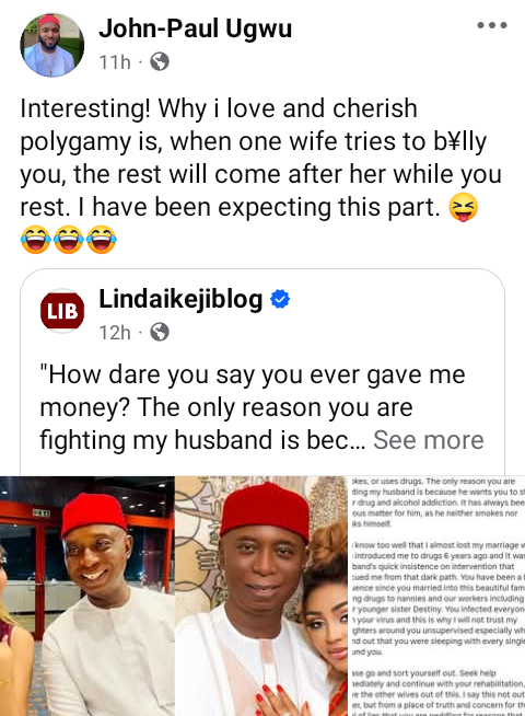 A self-proclaimed Nigerian polygamist, John-Paul Ugwu, has hailed Senator Ned Nwoko's 5th wife, after she called out her junior co-wife, Regina Daniels, The Nollywood actress had claimed to have given her co-wife, Laila Charani, money, alleging she was "feeding" Laila in their matrimonial home. Countering the claim, Laila said she never got money from Regina and also accused her of fighting their husband because he wants to stop her alleged drug and alcohol addiction." According to Laila, their husband has always been clear that he would never accept any wife who drinks, smokes or uses drugs as he completely hates such habits. Taking to Facebook, Ugwu, who recently celebrated his their wives, said that what Laila did is one of the reasons he cherishes polygamy.  Interesting! Why I love and cherish polygamy is, when one wife tries to bully you, the rest will come after her while you rest. I have been expecting this part, he wrote.