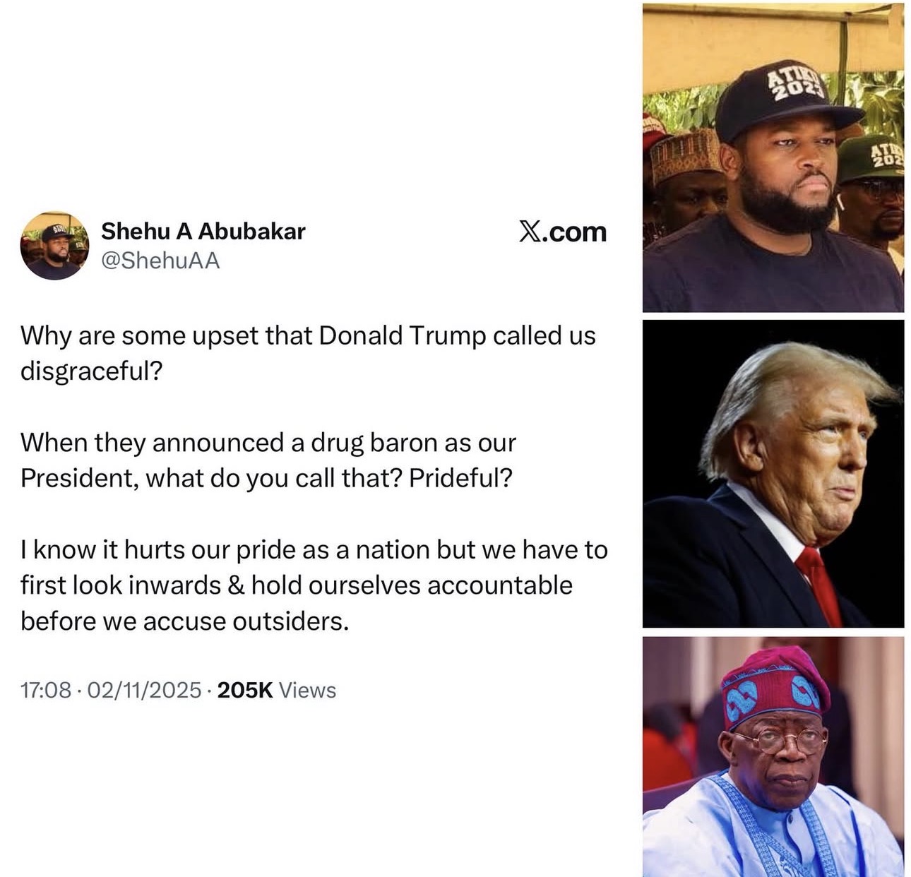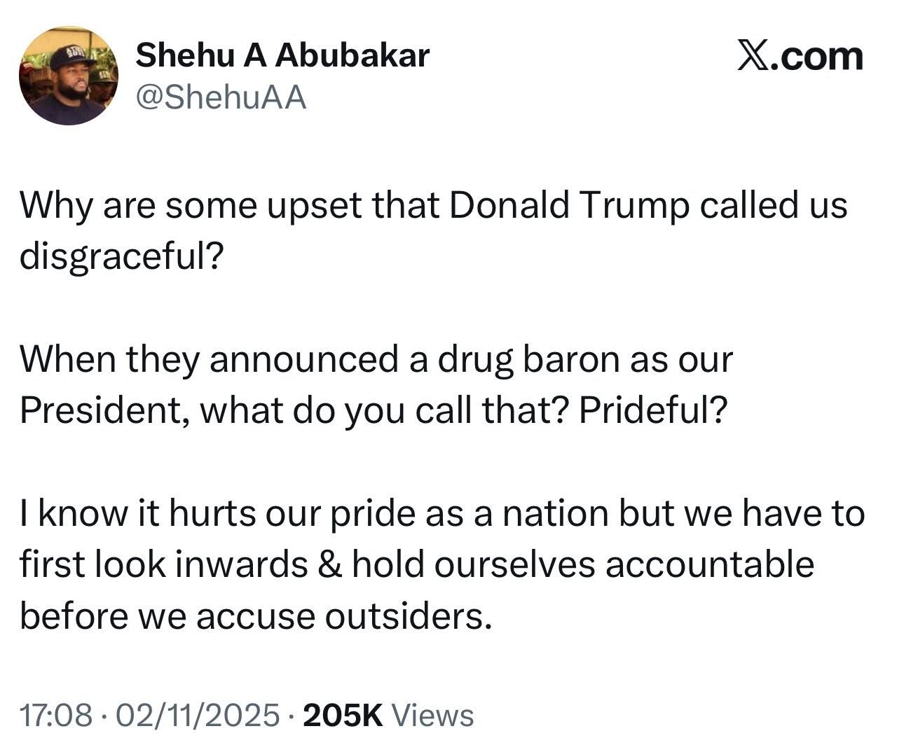 Atiku Abubakars son, Shehu Abubakar, has stirred widespread reactions online after questioning Nigerians who expressed outrage over former U.S. President Donald Trumps recent comments describing Nigeria as disgraceful. In a post shared on his verified X account, Shehu wrote: Why are some upset that Donald Trump called us disgraceful? When they announced a drug baron as our President, what do you call that? Prideful? I know it hurts our pride as a nation but we have to first look inwards and hold ourselves accountable before we accuse outsiders.
