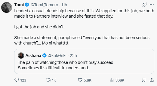 A woman has shared an incident that made her end her friendship with a friend of hers. She explained how they both applied for the same job and when she got it but the friend didn't, the friend who had prayed and fasted for the position, wondered how she got it when she is not serious with church. The X user shared her story in response to a tweet that reads: The pain of watching those who dont pray succeed Sometimes its difficult to understand. She responded: I ended a casual friendship because of this. We applied for this job, we both made it to Partners interview and she fasted that day. I got the job and she didnt. She made a statement, paraphrased even you that has not been serious with church. Mo ni whattttt. See below.