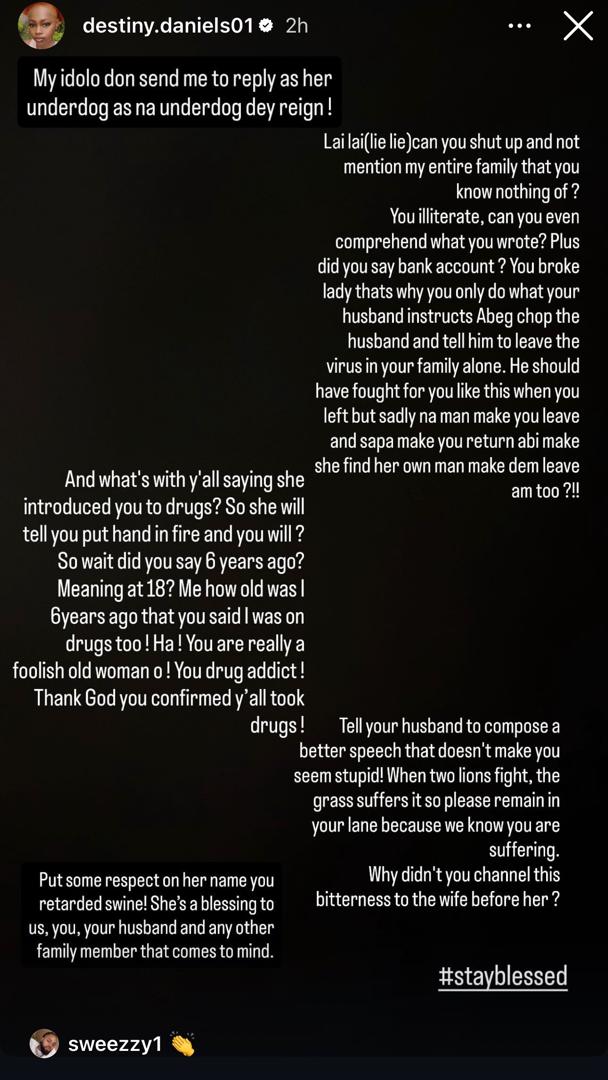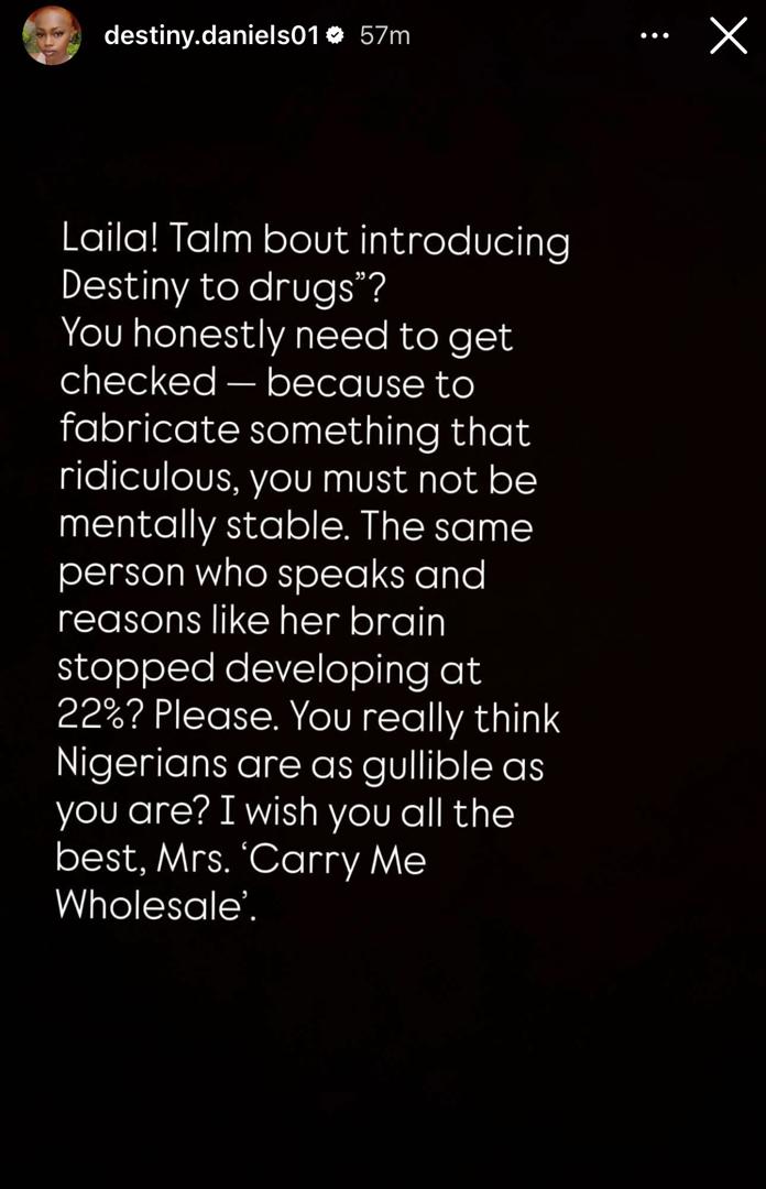 Destiny Daniels, the younger sister of actress Regina Daniels, has clapped back at Laila Charani, the 5th wife of lawmaker, Ned Nwoko, who accused her sister, Regina Daniels, of introducing women including herself, Destiny, to drug abuse.Laila in a statement released on her page last night, accused Regina of abusing hard drugs and introducing women including her younger sister, Destiny, to drugs.Destiny has now responded to the claim. According to Destiny, Laila must be retarded for making such a claim._1763045172.jpeg)