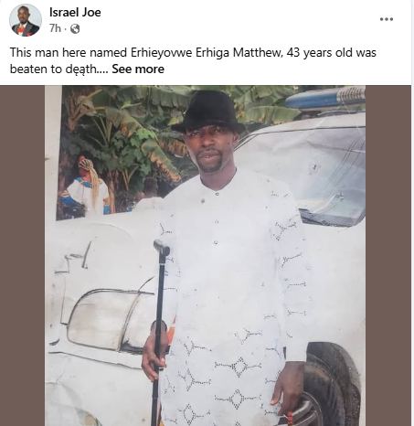 Activist, Joe Isreal, is demanding justice for a 43-year-old man identified a Erhieyove Erhiga Matthew, be@ten to de@th for allegedly dating a married woman'. In a post shared on his Facebook page, Isreal said the woman in question had been separated from her husband, Onoriode Efferunu, for over a year. According to him, the woman left her marriage due to domestic vlnc and irreconcilable differences. Isreal alleged that the estranged husband vowed to deal with any man who comes close to her. He accused the estranged husband of orchestrating the attack on the deceased which led to his de@th. His post reads''This man here named Erhieyovwe Erhiga Matthew, 43 years old was beaten to dth. It was xcuted in Okoroke -Ovu after Oviore, Ethiope East Local Government of Delta State.He was accused of dating a married woman. The said woman has been separated from her husband named Onoriode Efferunu for about a year, but the husband promised her that any man she stands with would face his wrath.The lady has four children for the husband and left the marriage due to domestic v!lnc and irreconcilable differences.Being that the said Onoriode is seen as a stakeholder in the community who has a loud voice, he publicly and systematically xcted this young man on an allegation that he was seen standing close to his separated wife.Mr. Matthew met his d@th on the 28th of October when community youths pounced on him, alleging that he slept with the woman because they saw him discussing with her. All attempt to talk about his innocence proved abortive as they continuously b@t him up tieing his two hands and legs. They led him with bId on him to the elders who did nothing to stop these youths and, of course, the woman's husband who now denies sending them.I will release the video shortly of how this man was molested, nd and kII. The woman has opened up and swore that she had nothing ever to do with this young man but her husband only wants to show that he owns the earth by keeping to his promise that she can never stand with any man or the man would face the wrath of his anger.A woman you continuously mIstd and chased out of your house wth domestic vInc, all of a sudden, you're so obsessed that you want to mrdr any man she stands with? Oga, you play go where quite family dey shall, if not by now, you self for don go where the man dey too.I have been following up, and the Mr. Onoriode's lawyer is right now at the State Command headquarters of the Nigeria Police Force Asaba, seeking bail for all the culprits arrested over this gruesome mrdr. The State CID should know that this matter is of public interest, hence, the IPO should thread with caution make we all nor go dance nkd for public the way dem n@kd the guy.I will release the video shortly in order for you to see man's inhumanity to man. Meanwhile, those elders should also be invited and arrested for conspiracy because they appeared to be sitting in the meeting and had the opportunity to save the man but rather have a verdict leading to the execution for which when the family arrived and rushed him to the hospital, he could not survive the incident.''