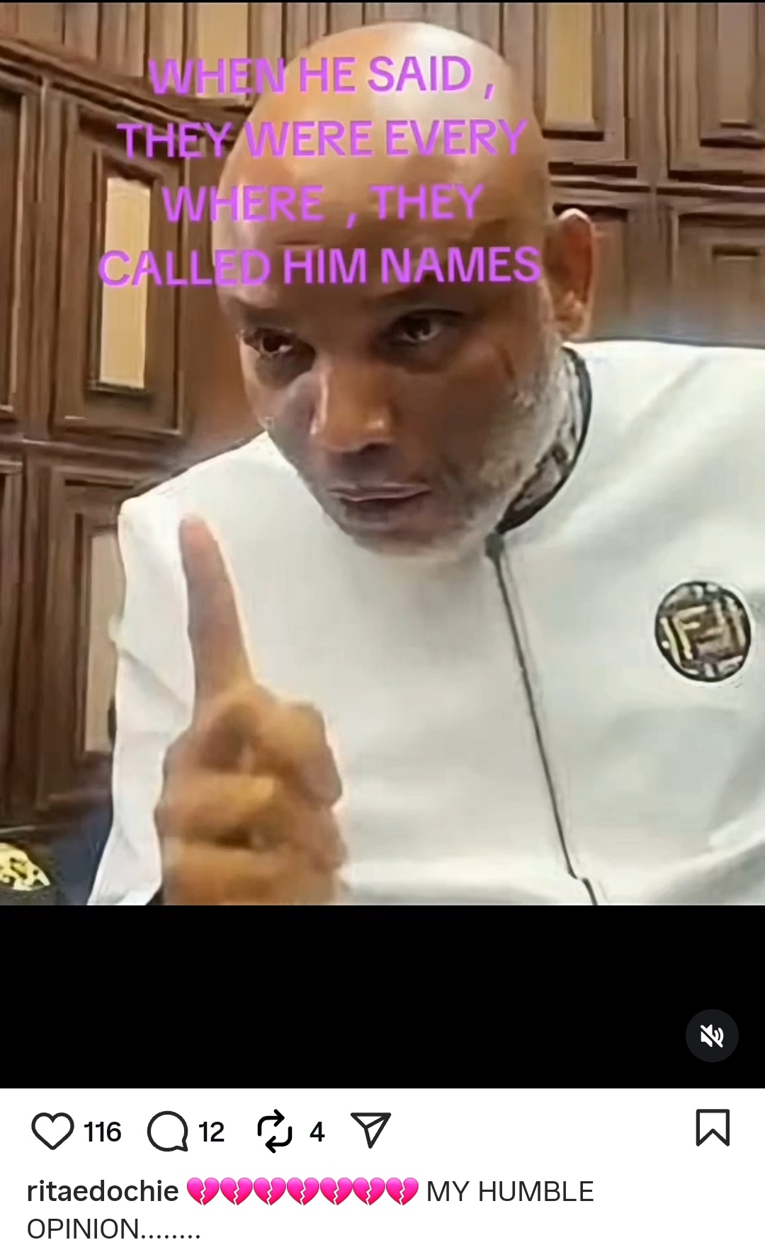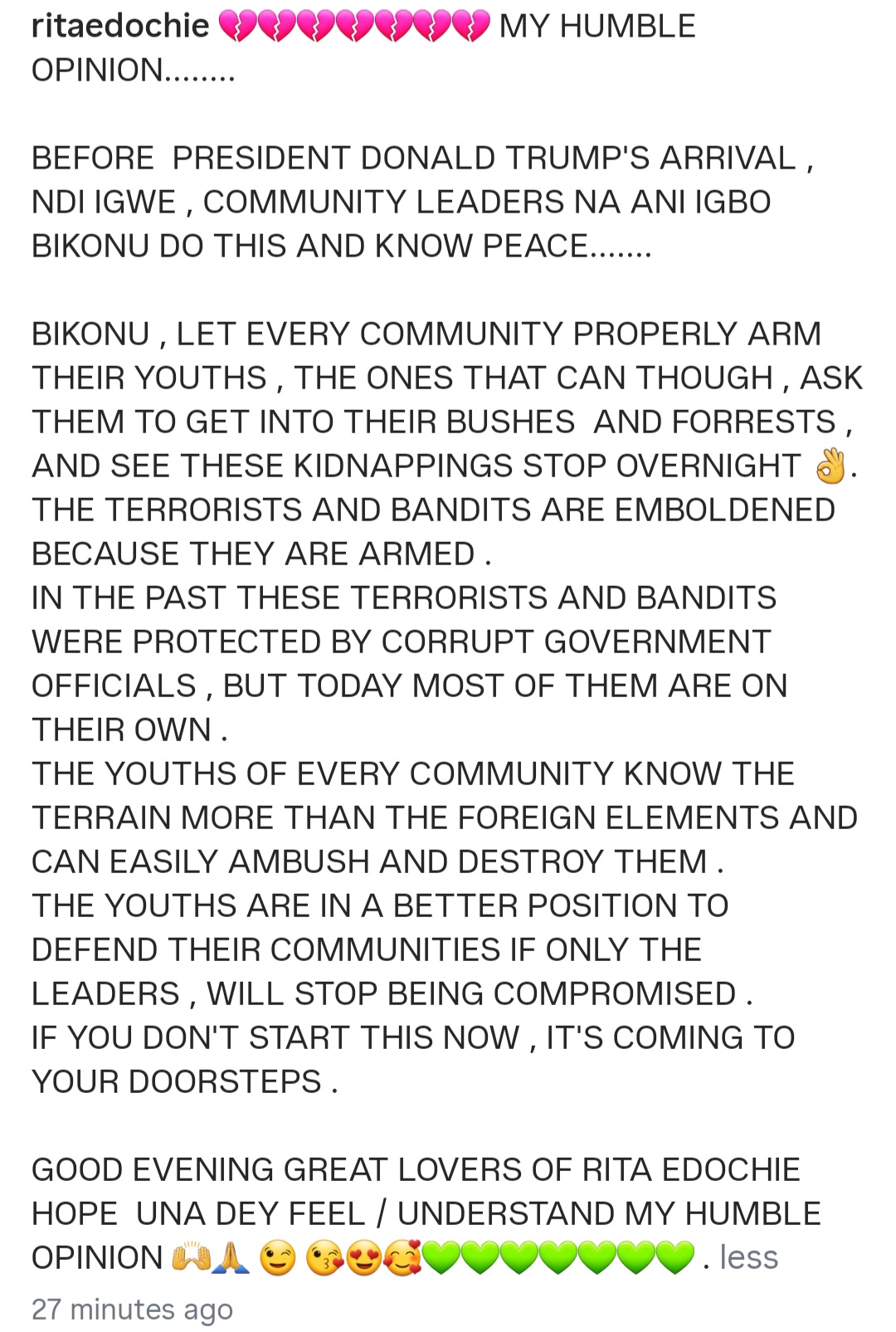 Rita Edochie has taken to Instagram to advise community leaders on the action to take to tackle insecurity in their communities. The actress shared a photo of the leader of the secessionist group, Indigenous People of Biafra, Nnamdi Kanu, who has be sentenced to life imprisonment after being convicted of terrorism. On the photo, Rita wrote that Nnamdi Kanu had warned that the terrorists were everywhere but he was called names. Suggesting ways to end the reign of terror in Nigeria, Rita urged community leaders to look for the strongest people in their communities and arm them to fight terrorists who are kidnapping and k!lling people She wrote: "MY HUMBLE OPINION........ "BEFORE PRESIDENT DONALD TRUMP'S ARRIVAL , NDI IGWE , COMMUNITY LEADERS NA ANI IGBO BIKONU DO THIS AND KNOW PEACE....... "BIKONU , LET EVERY COMMUNITY PROPERLY ARM THEIR YOUTHS , THE ONES THAT CAN THOUGH , ASK THEM TO GET INTO THEIR BUSHES AND FORRESTS , AND SEE THESE KIDNAPPINGS STOP OVERNIGHT. "THE TERRORISTS AND BANDITS ARE EMBOLDENED BECAUSE THEY ARE ARMED . "IN THE PAST THESE TERRORISTS AND BANDITS WERE PROTECTED BY CORRUPT GOVERNMENT OFFICIALS , BUT TODAY MOST OF THEM ARE ON THEIR OWN ."THE YOUTHS OF EVERY COMMUNITY KNOW THE TERRAIN MORE THAN THE FOREIGN ELEMENTS AND CAN EASILY AMBUSH AND DESTROY THEM . "THE YOUTHS ARE IN A BETTER POSITION TO DEFEND THEIR COMMUNITIES IF ONLY THE LEADERS , WILL STOP BEING COMPROMISED . "IF YOU DON'T START THIS NOW , IT'S COMING TO YOUR DOORSTEPS ."