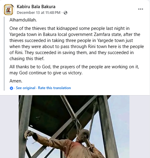 Angry residents have captured and crucified a suspected bandit after a failed operation in Zamfara State. The incident occurred in Bakura Local Government Area of the state. It was gathered that armed bandits invaded Yargeda community on Friday night, December 12, 2025 and abducted three residents. However while taking the victims through a forest, they passed through Rini village, they were intercepted by residents. The bandits managed to escape for luck ran out on one suspect. The suspect was tied up, and later lynched by the community before he was hung on a water tank structure. Security analyst Zagazola Makama confirmed the incident on Monday, December 15.