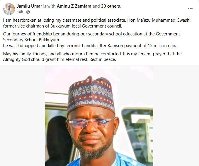 Bandits have k!lled a prominent Zamfara State political leader, Hon. Muazu Zannan Gwashi, after collecting N15m ransom. Bandits had on July 22, 2025, blocked the ManyaciBukkuyum road and opened fire on the vehicle of the Chairman of the Peoples Democratic Party (PDP) in Bukkuyum Local Government Area of Zamfara State, Hon. Muhammad Sala Wuta, shooting and injuring him. Gwashi, who was active in community affairs, was abducted alongside two others persons. Following the kidnapping, the captors initially demanded a ransom of N30 million, saying it would take about five months to release him. Negotiations later led to a reduction, and they agreed to accept N15 million. It was gathered that when N15 million was delivered, the bandits collected the money but refused to release him. They insisted that the remaining N15 million be paid, bringing the total ransom to N30 million, before they would free him. Months after Hon. Muazu Gwashi was abducted, kidnappers repeatedly shifted their ransom demands, first N30M, then N15M, then back to N30M even after collecting the first payment of N15M, a Katsina-based security expert, Malam Bakatsine, confirmed on Wednesday, December 10. Yesterday evening, his community confirms he has d!ed in captivity. A tragic end to a long ordeal. How many more families must face this cycle of extortion and loss? Similarly, a Facebook user, Mohammed Niimatullah from Zamfara, who mourned Gwashis d3ath, wrote on Wednesday evening: Innalillahi wa'inailaihim raju'un Allah yajikan Hon Mu'azu Muhammad Gwashi."