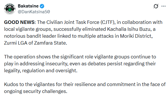The Civilian Joint Task Force (CJTF) in collaboration with local vigilante groups, have successfully eliminated a notorious bandit leader, Kachalla Isuhu Buzu, Zamfara State. Buzu was widely believed to be responsible for violent attacks, kidnapping on rural settlements including Moriki District in Zurmi Local Government Area of the state. According to local sources, the operation was carried out by Askarawan Zamfara during a coordinated security effort targeting criminal hideouts linked to persistent attacks on communities across the state. Residents said confirmation of the success of the operation was publicly communicated to reassure communities that the feared bandit leader had k!lled and beheaded. The development sparked celebrations in parts of the area, with many residents expressing relief and renewed confidence in ongoing security efforts. Community members described the outcome as a significant turning point, noting that the activities of the bandit leader and his network had caused prolonged fear, displacement, and economic hardship. Although official details of the operation are yet to be fully disclosed by security authorities, the development has been welcomed by residents who say it has brought a measure of calm and hope for improved safety in the affected communities.