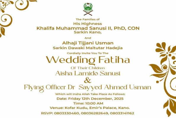 The 14th Emir Of Kano, HRH Khalifa Muhammad Sanusi II, has announced the upcoming wedding of his daughter, Aisha Lamido Sanusi. Aisha. who bagged First Class from University of Swansea, UK in 2023, will marry Flying Officer Dr. Sayyed Ahmed Usman, on Friday December 12, 2025, at the Emir's Palace in Kofar Kudu. Family members, including Fulani Siddika, shared the wedding invite on Thursday.