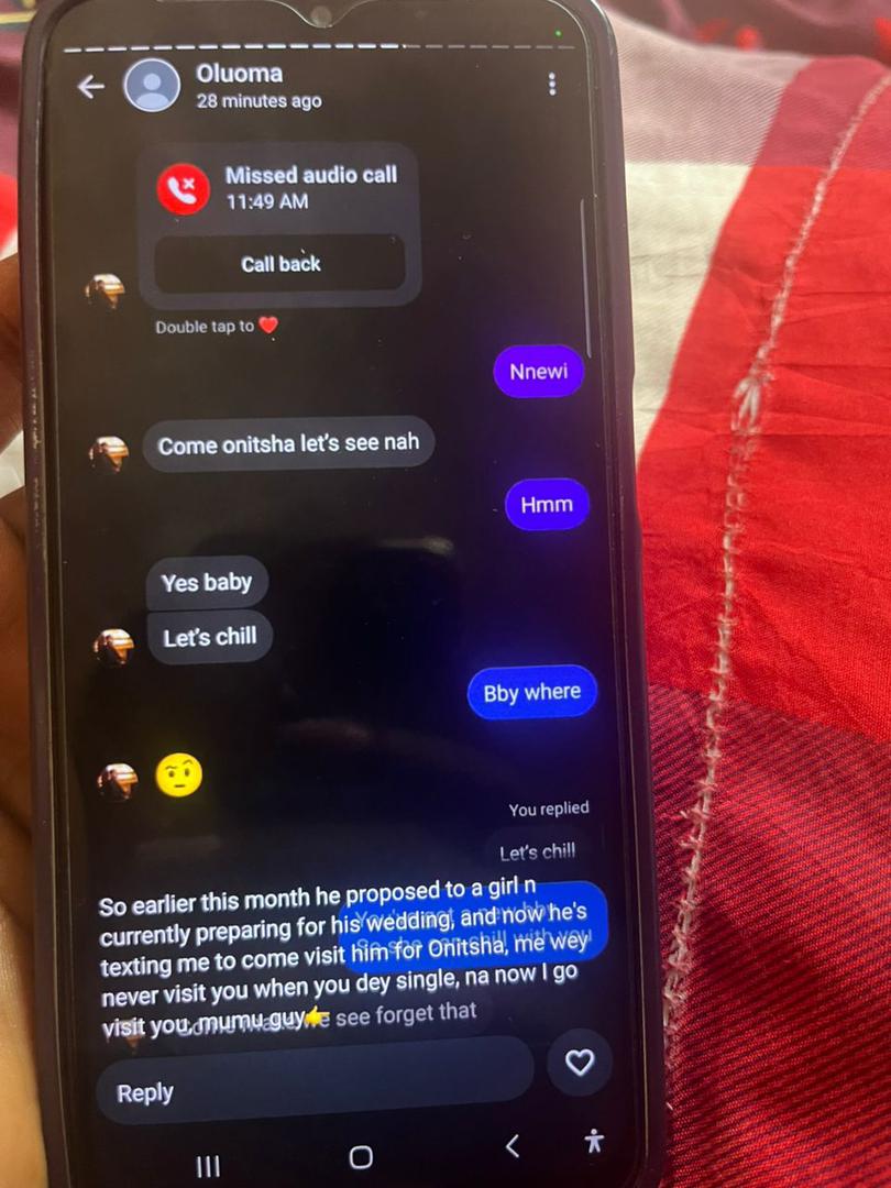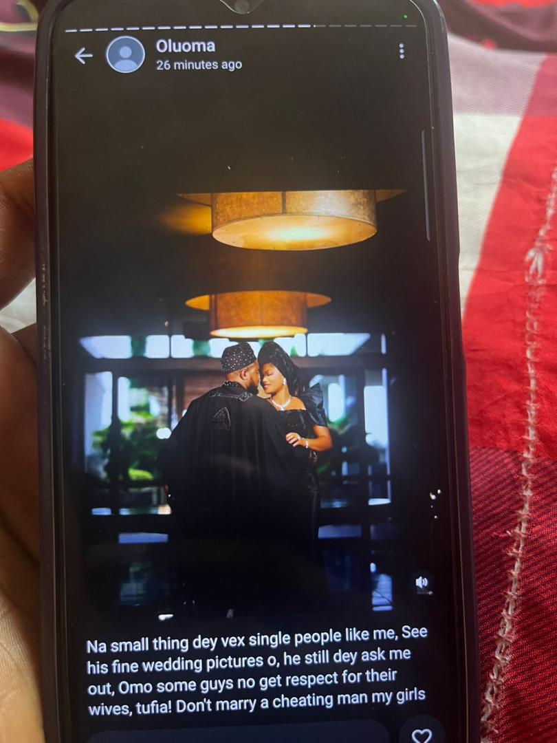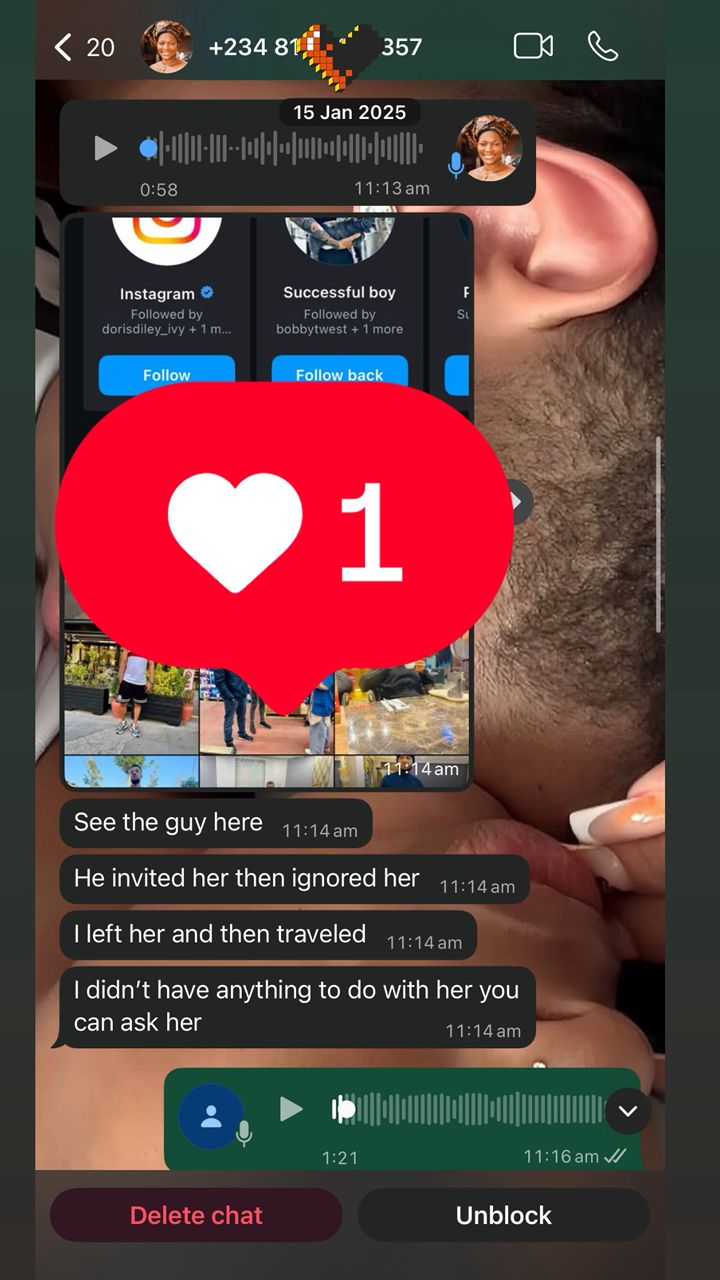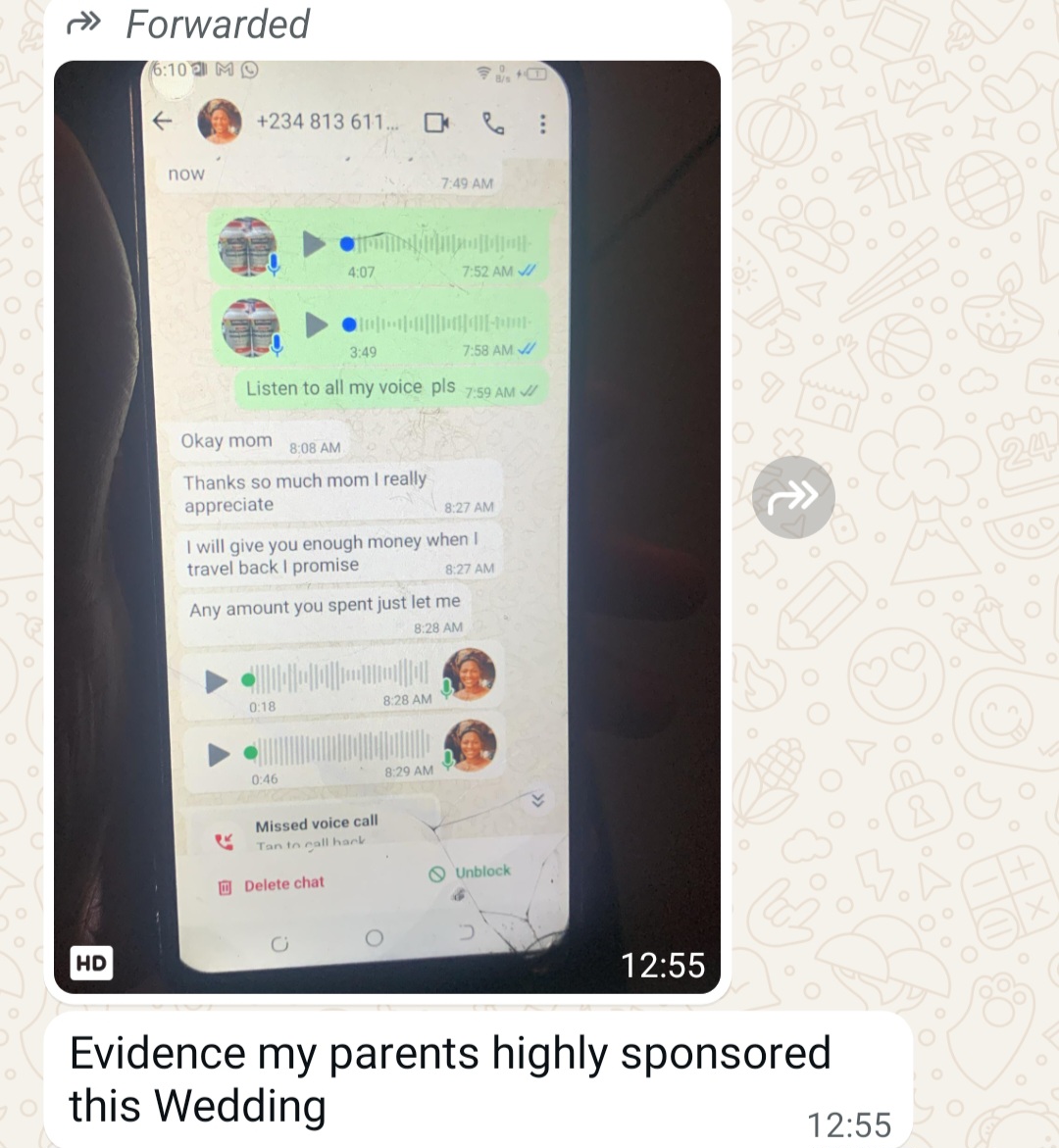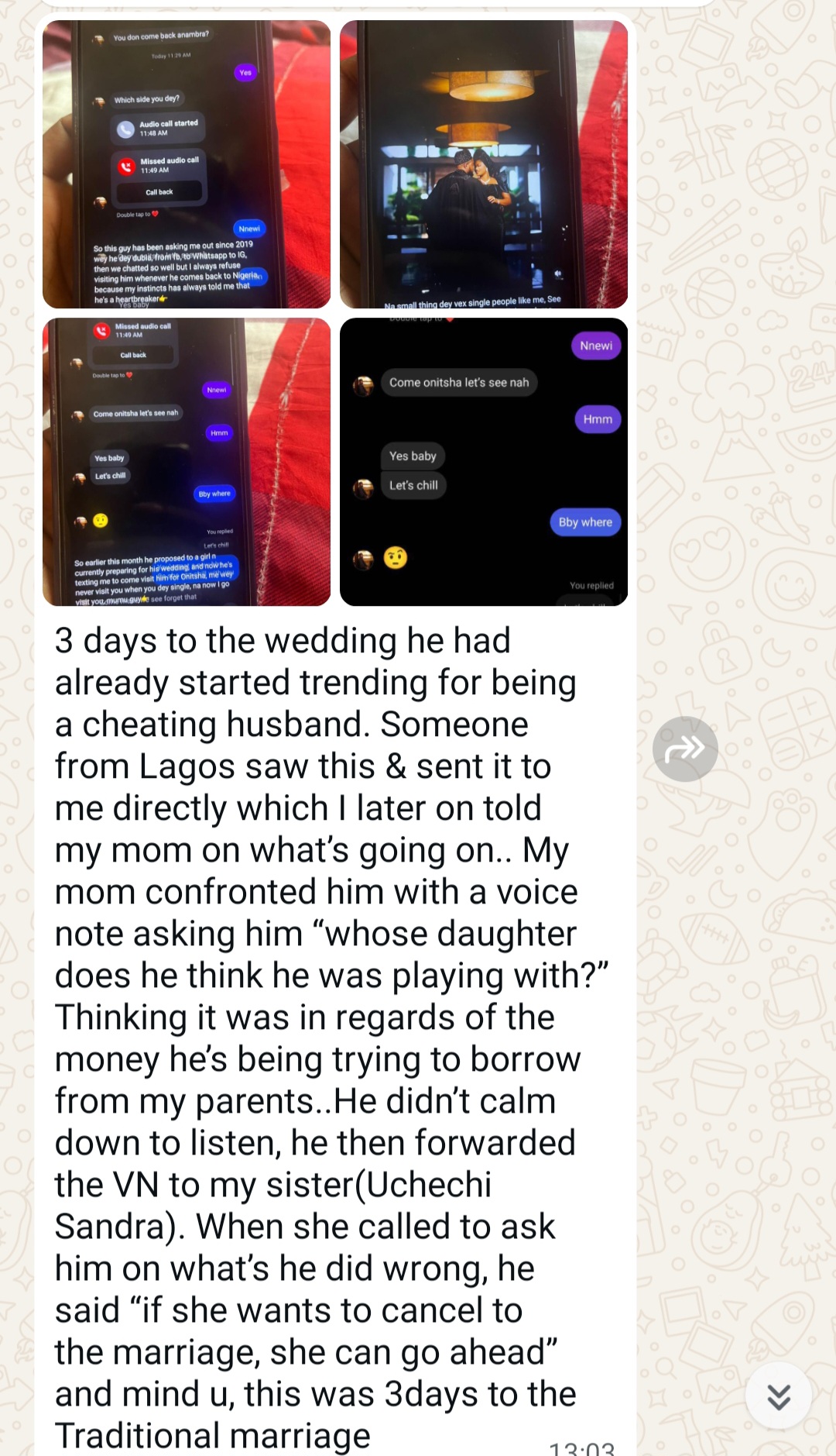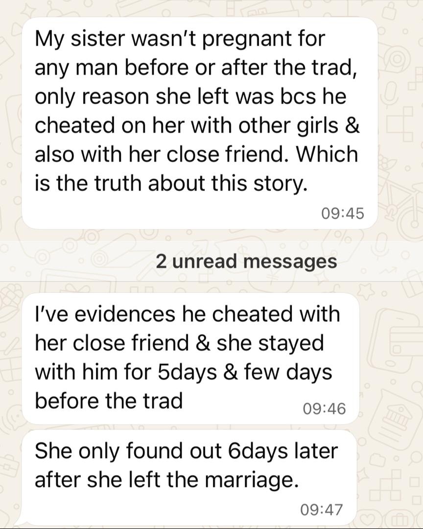 Eventually, when he saw Sandra had resolved to walk away, he allegedly began a smear campaign against her and changed the genotype incompatibility story. They said he made the claim that Sandra was pregnant to save face and tarnish Sandra's image after his pleas for her return fell on deaf ears. The family said he cheated with multiple women before the wedding, including one of his wife's ashoebi ladies. The video of the ashoebi lady involved will not be shared here to protect her identity. The family also shared screenshots of women calling him out two days before his wedding, claiming he was involved with them, but when the family confronted him about it in a voice note shared with LIB, he said they were jealous women who wanted to destroy his wedding. Hence, the family allowed the wedding plans to continue.