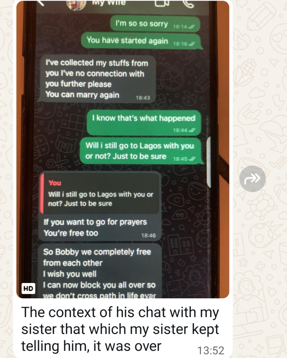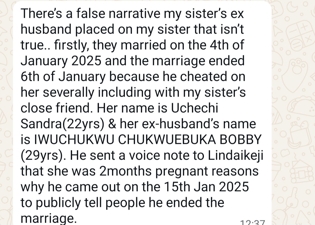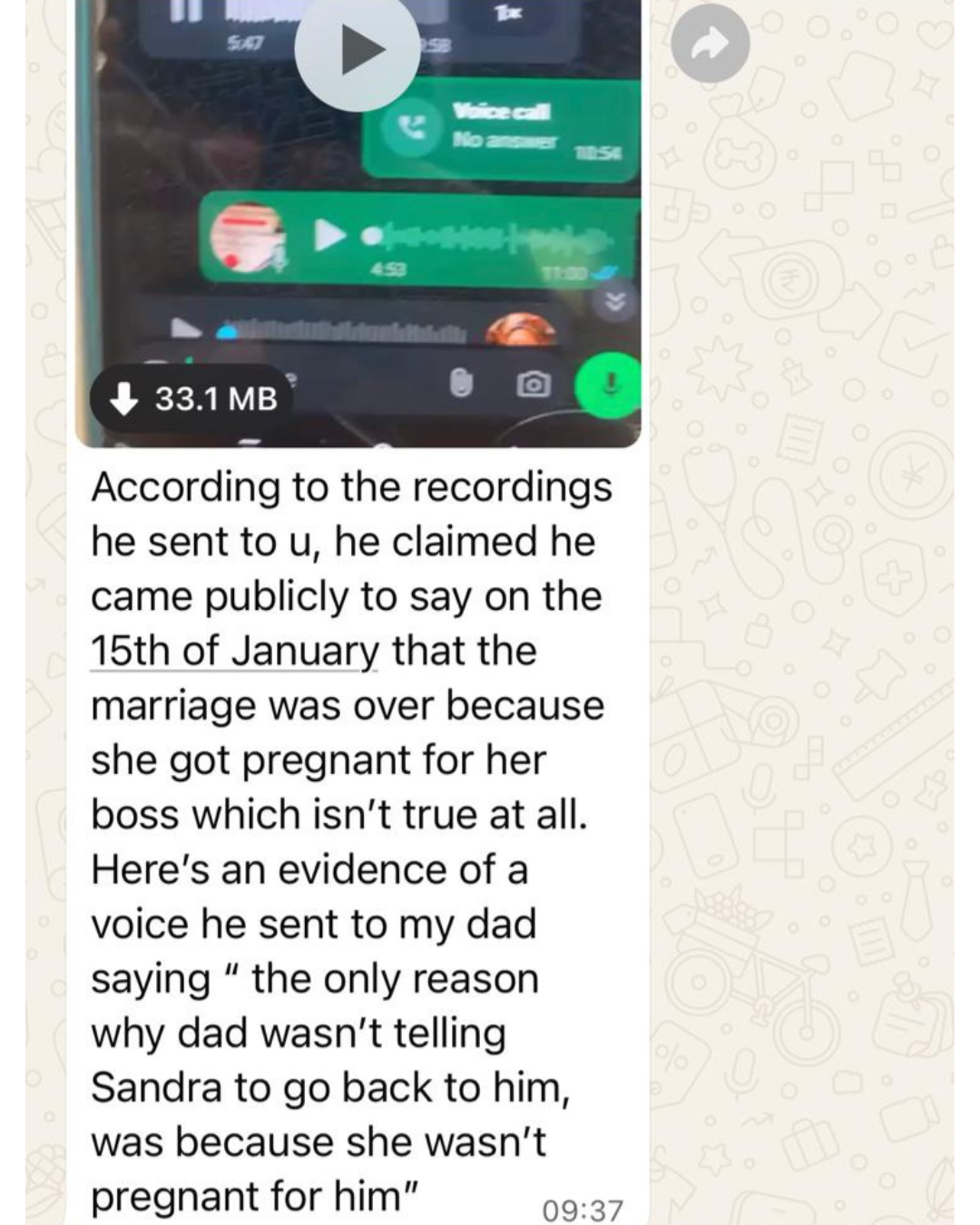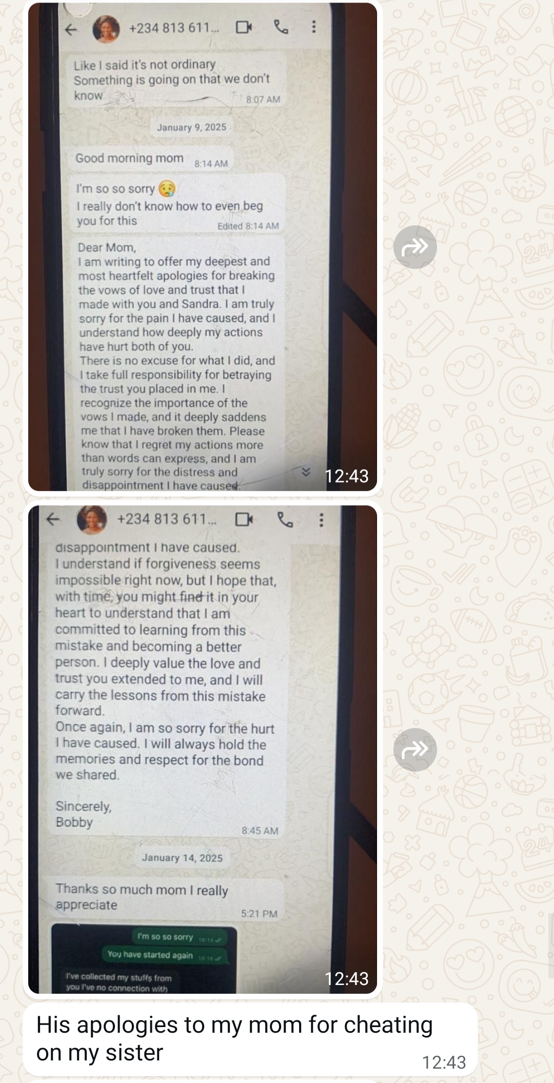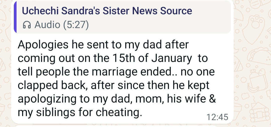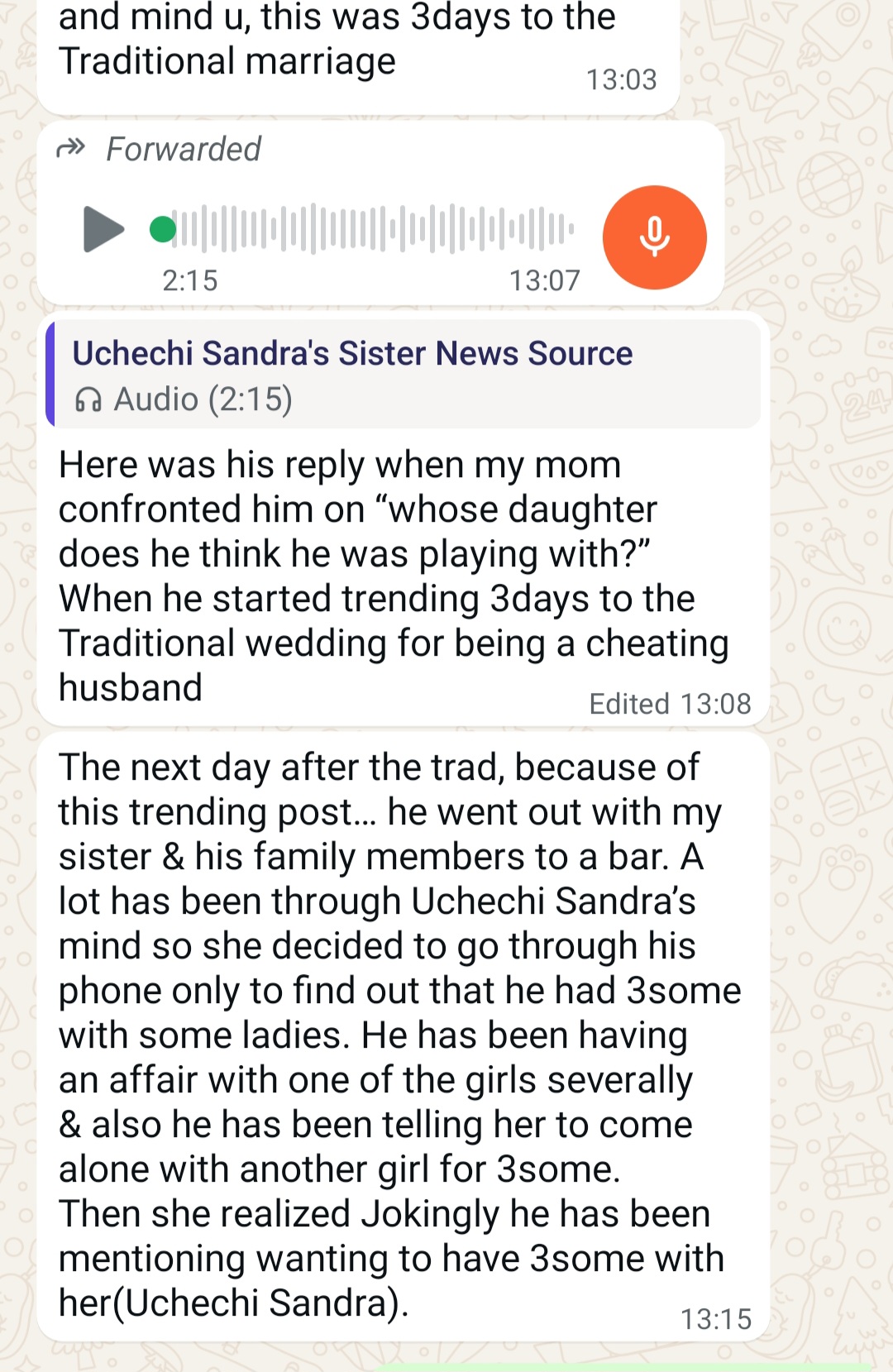 They shared with us audio recordings, purportedly of Chukwuebuka, aka Bobby, begging Sandra's father for forgiveness for cheating on his child with multiple women, including with one of her friends. "If she wants me to lie down and apologise, I'll lie down and apologise just for her to know how sorry I am. I won't do it again," Bobby is heard begging his father-in-law in after his new wife left him 2 days after wedding. The family also shared screenshots of messages Bobby sent to their mother and to Sandra's sisters, begging for forgiveness for cheating on Sandra while asking them to beg her not to end the marriage.