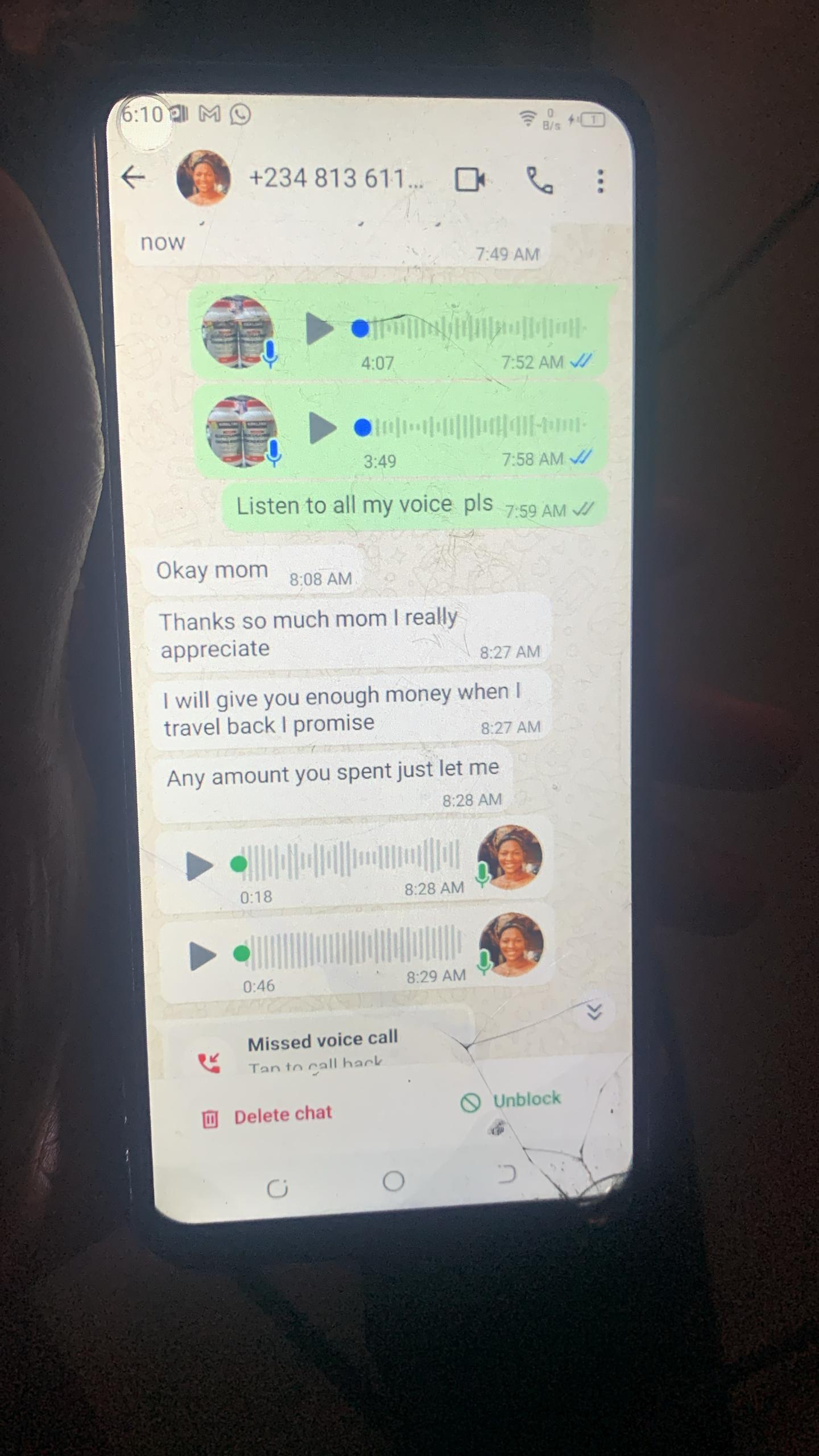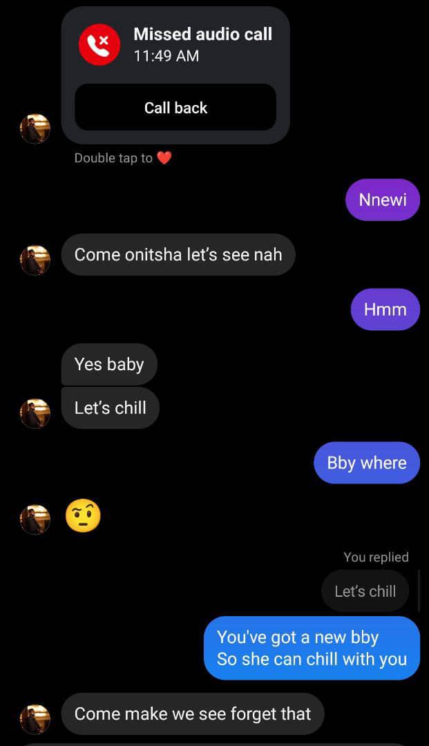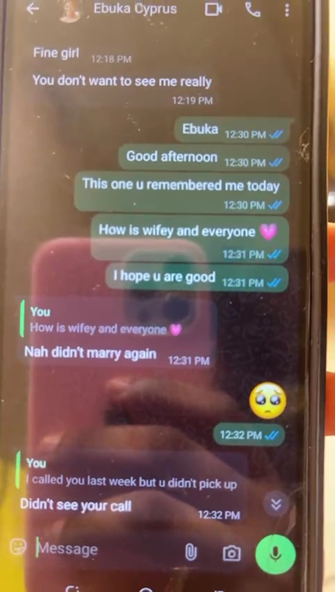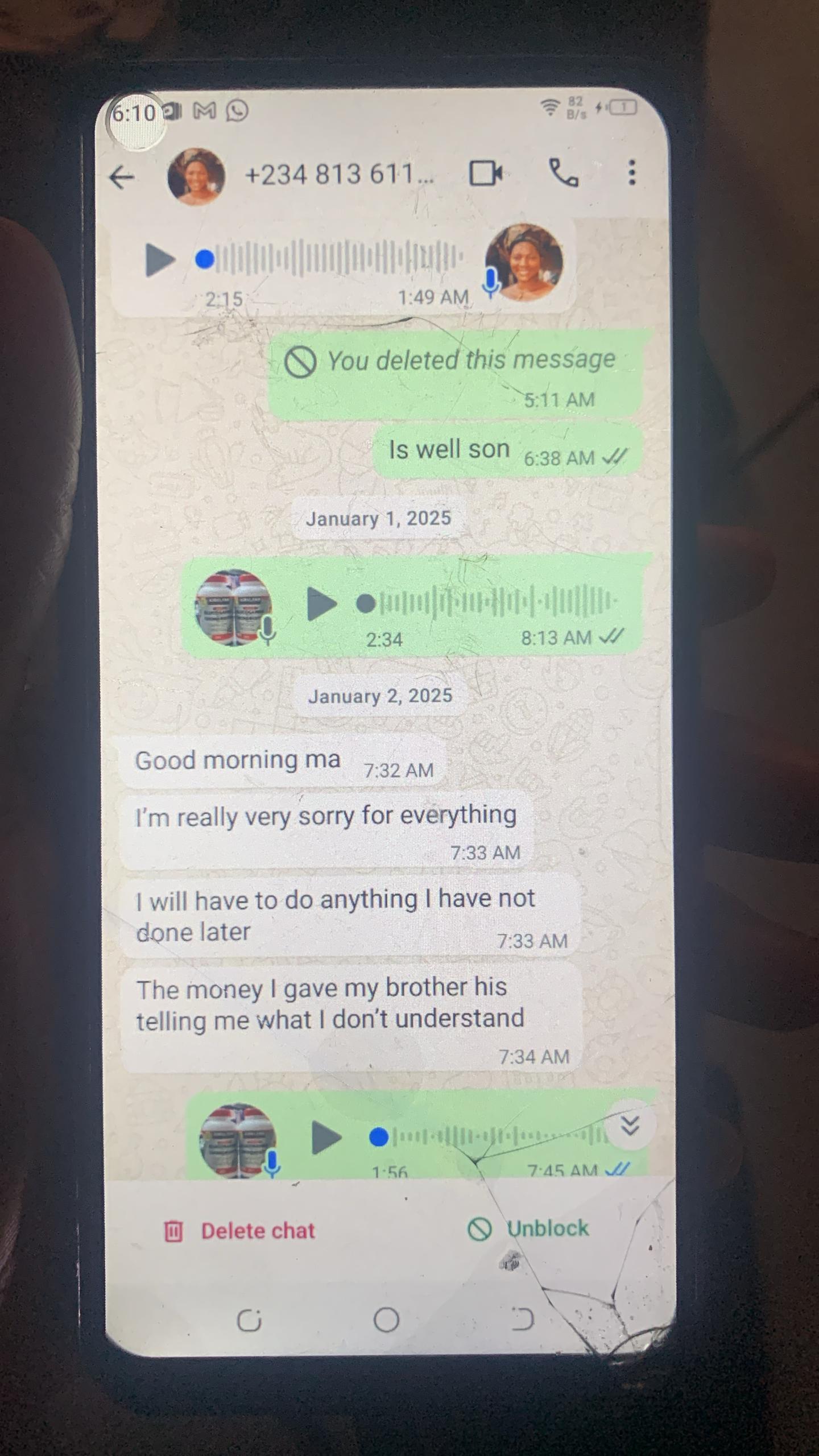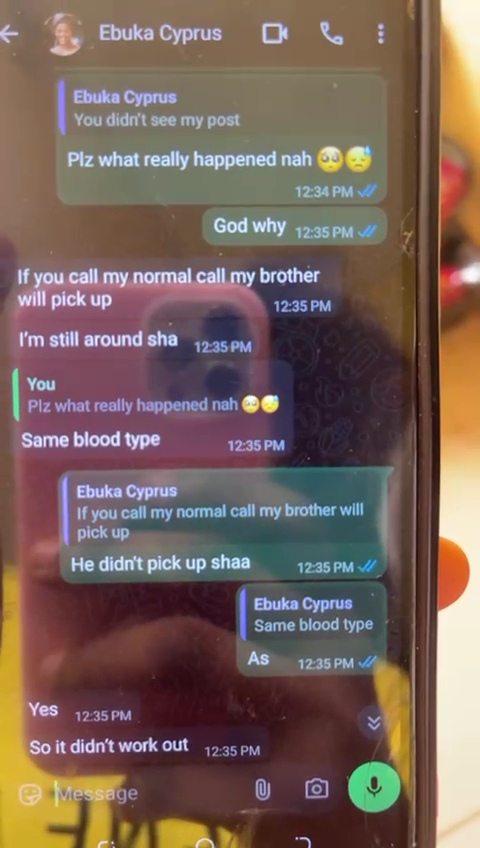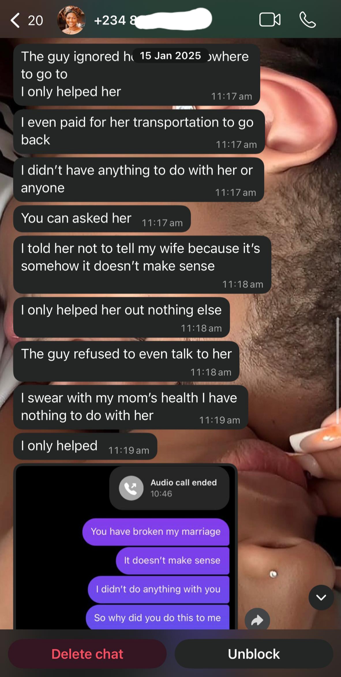 They shared with us audio recordings, purportedly of Chukwuebuka, aka Bobby, begging Sandra's father for forgiveness for cheating on his child with multiple women, including with one of her friends. "If she wants me to lie down and apologise, I'll lie down and apologise just for her to know how sorry I am. I won't do it again," Bobby is heard begging his father-in-law in after his new wife left him 2 days after wedding. The family also shared screenshots of messages Bobby sent to their mother and to Sandra's sisters, begging for forgiveness for cheating on Sandra while asking them to beg her not to end the marriage.