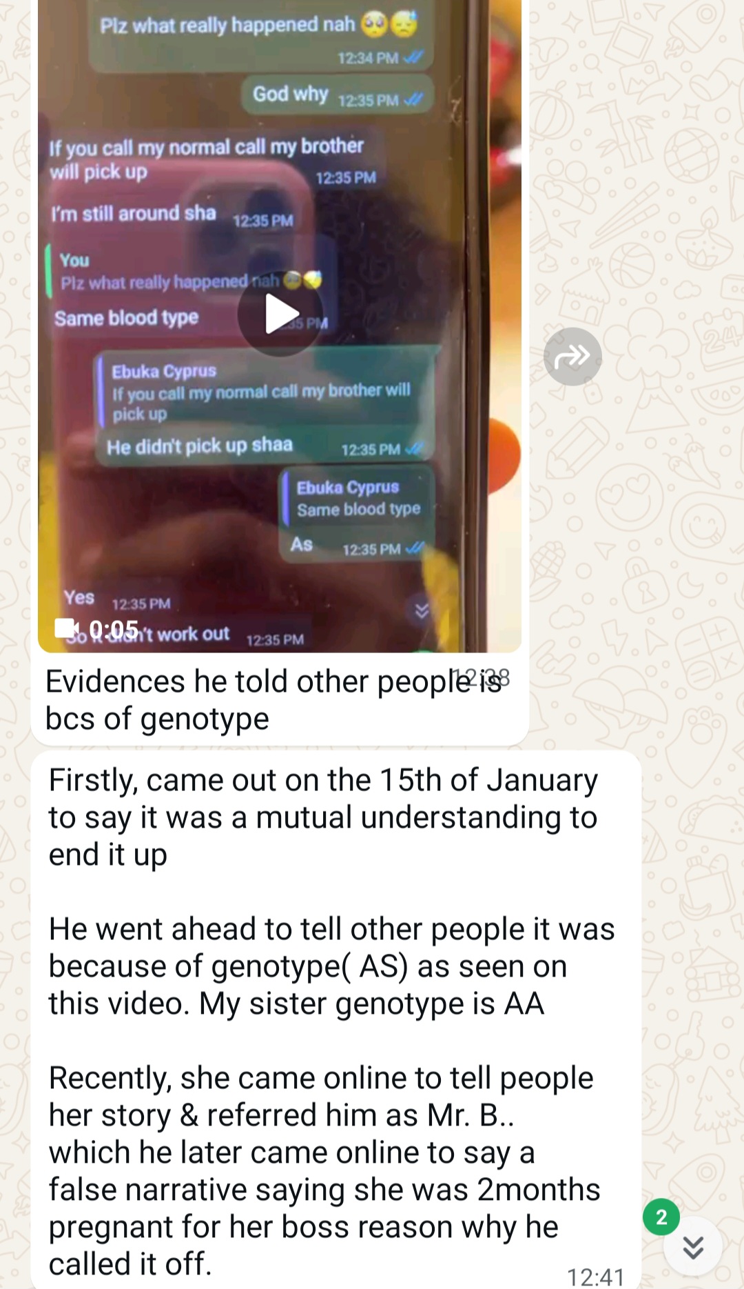Another screenshot purportedly shows him attempting to strike up a relationship with another woman and when she asked if he wasn't married, he claimed the marriage ended due to genotype issues, claiming they were both AS, even though Sandra is AA.