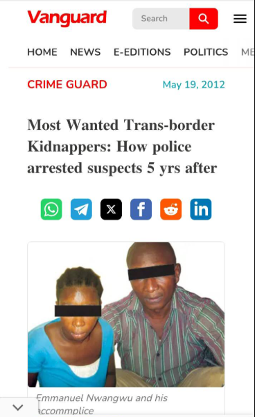 Investigations have revealed that Emeka Emmanuel Nwangwu, the 51-year-old member of Neighbourhood Security Watch Group, who m8rdered his maternal cousin, Loveth Uloma Nwangwu, in Nsukka, Enugu State, was a notorious trans-border kidnapper who abducted several children while working as a driver. LIB reported that police arrested Nwangwu for k!lling 19-year-old Loveth at a pharmacy days after she reportedly accused him of years of s3xual abuse. According to a Vanguard report dated May 19, 2012, Nwangwu abducted the daughter of Folarin Coker, a former aide to the ex-Lagos State Governor, Babatunde Fashola. Following Nwangwu's arrest alongside his wife, he also confessed to having fled his home town in Opi, Nsukka Local Government of Enugu State to Lagos after st@bbing his fiance when she decided not to marry him. Nwangwu, who was employed into Folarin and Folake Cokers home as a driver abducted their little daughter and took her to a neighboring African country. Nwangwu, who worked barely one month before absconding with the little girl, didnt show any signs that may have attracted the attention of his employees to his evil intention. On the day he left, he craftily deceived a female house help working for the couple who normally accompany him to the school to pick the girl by sending her to a departmental store along Awolowo Way, Ikoyi to buy some drugs. However, as soon as the girl left, he smartly ferried the child to Mile 2 area of Lagos State and through the aid of his fiance, Patricia Abena, they boarded a cab that took them straight to Ghana. Meanwhile, the Cokers werent the only family who fell victim to Nwangwus exploits. In 2009, two other families, Mr. Afam Edozie, a resident of Banana Island ended up paying N21m as ransom before he released their little daughter. One Mrs. Folusho Odegbaide, of Magodo area of the state also paid N2.5 ransom to Nwangwu before he released her abducted child. Read HERE HERE HERE In the case of Afam Edozie, there was an ugly twist to the kidnap saga after the Police in Ghana ended up releasing Nwangwus wife, Patricia, after she was arrested while trying to withdraw the N12m ransom they demanded. It was gathered that after kidnapping Mr. Edozies daughter and demanding for a ransom, Nwangwu and his wife became apprehensive when they noticed that the Edozies contacted both the police at Interpol, Alagbon, Lagos and their Ghanaian counterparts. Both security agencies perfected plans to arrest Nwangwu and his wife when they attempted to withdraw the ransom money and also rescue the kidnapped child. But the reverse was the case as the Ghanaian police took the ransom from Patricia who they intercepted after she withdrew the money from the bank and set her free without informing Mr. Edozie and the Nigeria Interpol who were waiting for a good news. Later on, Nwangwu placed a call to Mr. Edozie informing him of their losses to the Ghanaian police and then threatened that his child would be k!lled if he does not pay another N12 m. Mr. Edozie was said to have pleaded that they should accept N9m which he later paid and his child was released to him. It was further gathered that news of the Ghanaian police shameful act soon infuriated the Ghanaian police high command who arrested and tried eight police officers who took part in the ransom theft and later dismissed them from the Ghana Police Service. The Ghanaian police didnt stop at that in trying to redeem their image, they quickly declared Nwangwu and his wife, Patricia, the most wanted criminal in Ghana. Their pictures were published and announced in almost all the media outlets in that country. However, before these steps were taken, Nwangwu and his wife had spirited themselves away from Ghana before the authorities could lay hands on them. Crime Guard learnt that the couple were smuggled into Ivory Coast where they spent some few nights before flying into Sierra -Leone where they spent a year and half before relocating to Benin Republic where they set up a new base. From Benin Republic, the couple returned to Lagos again, using the same modus operandi. His wife secured a nanny job at one Mrs. Odegbaides home just as in the Edozies home. She worked barely for one month before disappearing with their little daughter. They took her to Benin Republic and then contacted Mrs.Odegbaide demanding N20 m as ransom. She pleaded that she had no such money but begged that they accept N2.5m which she later paid before re-uniting with her daughter. According to the Vanguard, the Cokers who vowed that the kidnappers of their daughter in 2008 and who also swindled them of large sum of money must be brought to book did not relent in fighting for justice. They reliably kept on fighting and pressurizing the police to track down Nwangwu and his wife. A police source who pleaded anonymity, said that man was undeterred. He didnt go to bed like others did. He kept on pressurizing us. He was highly ready to provide mobility for us whenever we pick up a lead on the man and his wife. First, he was working with the police at Ikoyi Division but they were finding it difficult analyzing some of the lead they got on the suspects. Then, they transferred the case to the special anti-robbery squad, SARS, Ikeja, where the officer in charge, SP. Abba Kyari, mandated his crack team to trail and apprehend the suspects. Incidentally, few months after Nwangwu and his wife received the N2.5m ransom from Mrs.Odegbaide, they decided to relocate to Lagos as they always did, but on arrival, they realized that the state was too hot for them as security agents from various quarters were on their trail. By then, policemen from Force Criminal Investigations Department, Alagbon, Zone 2 Command, Onikan, several police divisions in the state, the State Security Service, SSS, and SARS, Ikeja, were frantically searching for them as news of their ejection from Ghana filtered in. After spending few days in Lagos, the couple ran to Abuja with the aim of starting fro