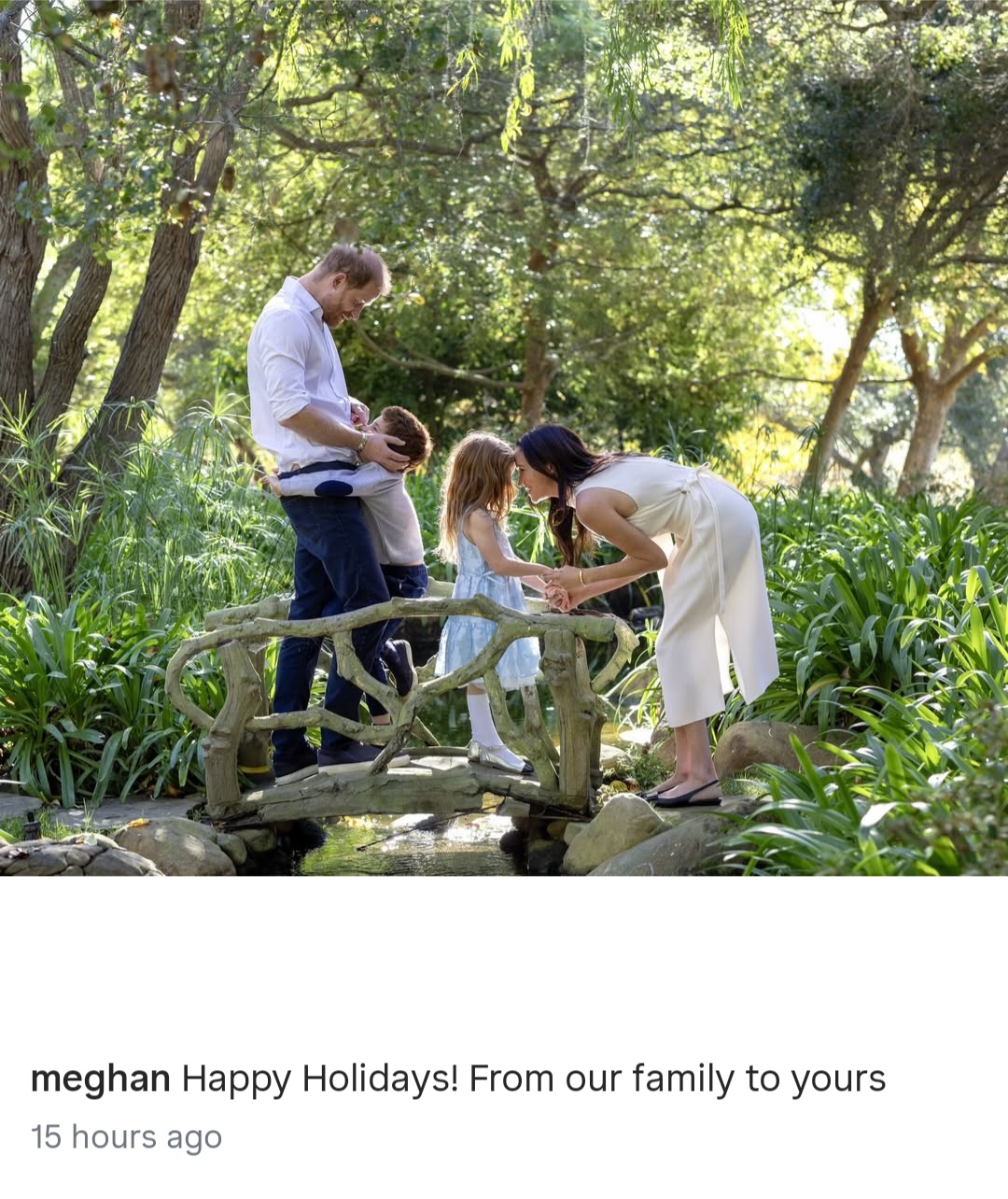 This time, Archie and Lilibet are seen with their parents. The family of four can be seen in a forest setting on a very small bridge above a pond, with Archie hugging his father and Lilibet nuzzling her mothers nose.The post Harry and Meghan share 2025 family Christmas card appeared first on Linda Ikeji Blog.