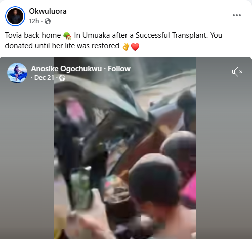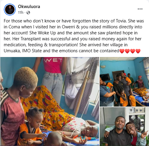 A Nigerian woman, Tovia, reunited with her family amid tears, cries of joy and embraces after a successful kidney transplant. A friend, Anosike Ogochukwu, on Sunday shared a celebratory video showing the heartwarming and emotional moment Tovia reunited with her children, mother and other family members in her hometown. According to Anosike, when Tovia was diagnosed with kidney disease after giving birth to her twins, her husband abandoned her for another woman. Tovia spoke out from her hospital bed, appealing to Nigerians to come to her aid so she could live a normal life again and take care of her children. Through media personality, Okwuluora, well meaning Nigerians raised money for the kidney transplant. "Drop your congratulations. If you are on TikTok you will know my friend. Her kidneys failed while giving birth to her twins.Her husband moved on with another lady in less than a year. Was even posting the girl on his status, a status his wife still views. My friend will call me everyday crying. She came out and cried to the public through the help of Okwulora. Nigerians raised money for her. And today she is back, back to her mother alive. Watch the video and drop your congratulations. Kidney transplant successfully done, she wrote.