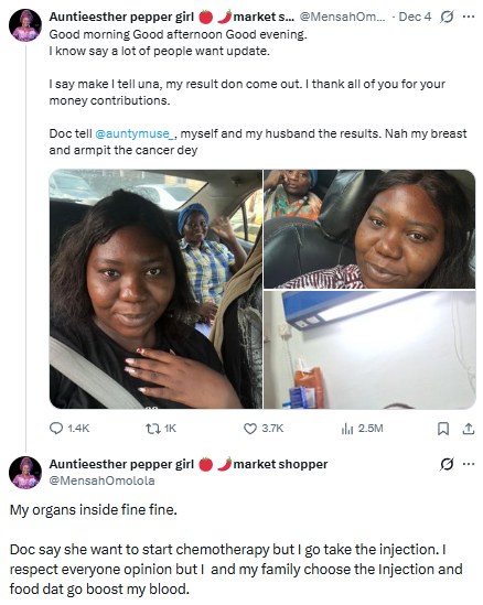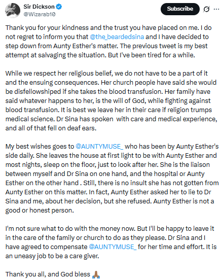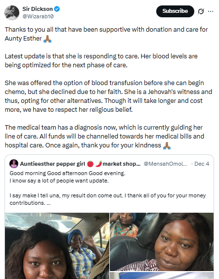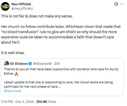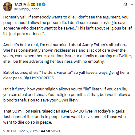 The revelation that she was refusing blood transfusion sparked outrage and led to a debate on X. Former Big Brother Naija reality star, Tacha weighed in, writing: "Honestly yall, If somebody wants to diie, i dont see the argument, you people should allow the person die. I dont see reasons trying to save someone who doesn't want to be saved..'This isn't about religious belief it's just pure madness'. "And lets be for real, I'm not surprised about Aunty Esthers situation.. She has consistently shown recklessness and a lack of care over the years, even when there's a serious issue or a family mourning on Twitter, she'll be there advertising her business with no empathy. But of course, shes Twitters Favorite so yall have always giving her a clear pass. "Big HYPOCRITES Isnt it funny, how your religion allows you to lie listen! If you can lie, you can steal and cheat. Your religion permits all that, but won't allow a blood transfusion to save your OWN life?? That 30 million Naira raised can save 50-100 lives in today's Nigeria! Just channel the funds to people who want to live, and let those who want to diie do so in peace.
