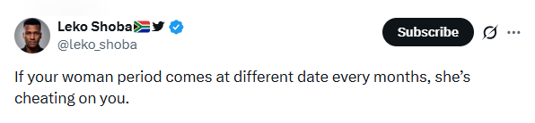 A South African man, Leko Shoba, has claimed that a woman who sees her monthly menstruation at different dates is cheating on her man. If your woman's period comes at different dates every month, shes cheating on you, he wrote on Tuesday.