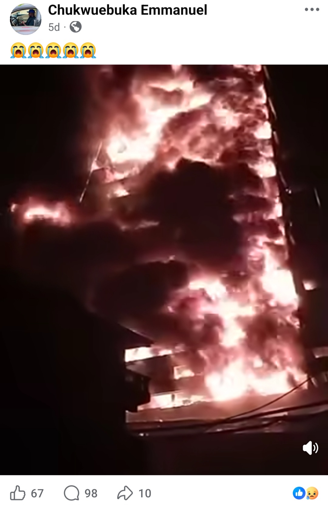Friends are mourning a man who is suspected to have did in the fire at Great Nigeria House. Chukwuebuka Emmanuel had been home when the fire started five days ago, and he did a video from his house, expressing shock about the fire. Friends claim he then drove with his brother to the shopping centre in Lagos Island from where he went live on Facebook as he filmed the burning building. Sadly, that was his last post. Since then, he and his brother have not been seen.