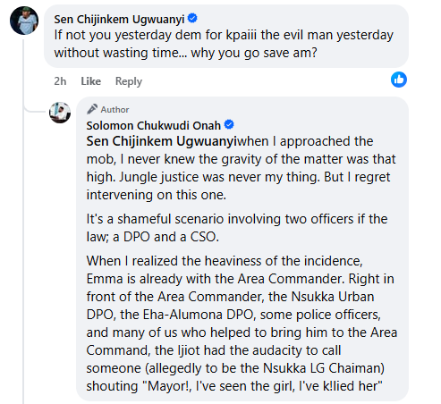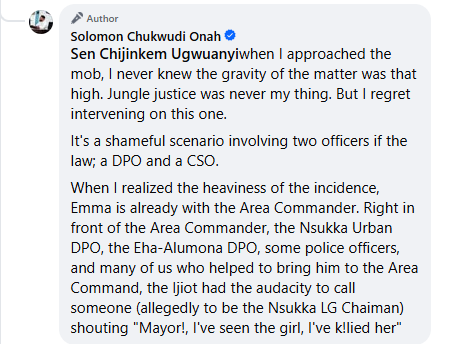 Solomon Chukwudi Onah, the man who rescued a m8rder suspect, Em3ka Emmanuel Nwangwu, from an angry mob in Enugu has opened up on what transpired at the police station. LIB reported that the Enugu State Police Command, through operatives of the Nsukka Urban Division, with the support of Neighbourhood Watch Group, on Monday, December 1, 2025 arrested Nwangwu, 51, for the gruesome m8rder of his maternal cousin, Loveth Uloma Nwangwu, aged 19. According to the spokesperson of the command, SP Daniel Ndukwe, the deceased had earlier reported a Case of defilement, sexu@l abuse, abd#ction, and threat to life against the suspect on 28th November 2025 to Umabor Division. Loveth alleged that she had been living with the suspect since 2019, at age 13, after the de@th of his wife, and that he had restricted her communication with family and friends and subjected her to sexu@l abuse. The suspect, a member of the Neighbourhood Security Watch Group, forced his way into a pharmacy where the victim was receiving treatment, assaulted her, and struck her head repeatedly on the floor, k!lling her. Solomon Onah said he rescued the suspect from the mob and drove him to Nsukka police station. According to him, immediately they arrived at the station, the suspect called someone on the phone, telling the person that he k!lled the girl. He expressed regret for rescuing the suspect after realising the gravity of his offence. When I approached the mob, I never knew the gravity of the matter was that high. Jungle justice was never my thing. But I regret intervening on this one. It's a shameful scenario involving two officers of the law; a DPO and a CSO," he wrote. When I realized the heaviness of the incident, Emma was already with the Area Commander. Right in front of the Area Commander, the Nsukka Urban DPO, the Eha-Alumona DPO, some police officers, and many of us who helped to bring him to the Area Command, the idiot had the audacity to call someone (allegedly to be the Nsukka LG Chaiman) shouting Mayor!, I've seen the girl, I've k!lied her he wrote.