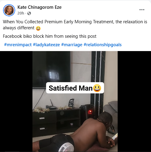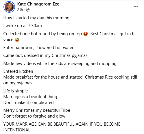 A Nigerian woman, Kate Eze, has said that marriage is beautiful but requires intentionality to thrive. The mother of three stated this when she shared a video of her husband relaxing on Christmas Day after she gave him premium early morning treatment by being on top" "When You Collected Premium Early Morning Treatment, the relaxation is always different. Facebook biko block him from seeing this post," she wrote. How I started my day this morning. I woke up at 7.30am. Collected one hot round by being on top. Best Christmas gift in his voice. Enter the bathroom, showered with hot water. Came out, dressed in my Christmas pyjamas. Made a few videos while the kids are sweeping and mopping. Entered the kitchen. Made breakfast for the house and started Christmas Rice cooking still on my pyjamas. "Life is simple. Marriage is a beautiful thing. Don't make it complicated. Merry Christmas my beautiful Tribe. Don't forget to forgive and glow. YOUR MARRIAGE CAN BE BEAUTIFUL AGAIN IF YOU BECOME INTENTIONAL.