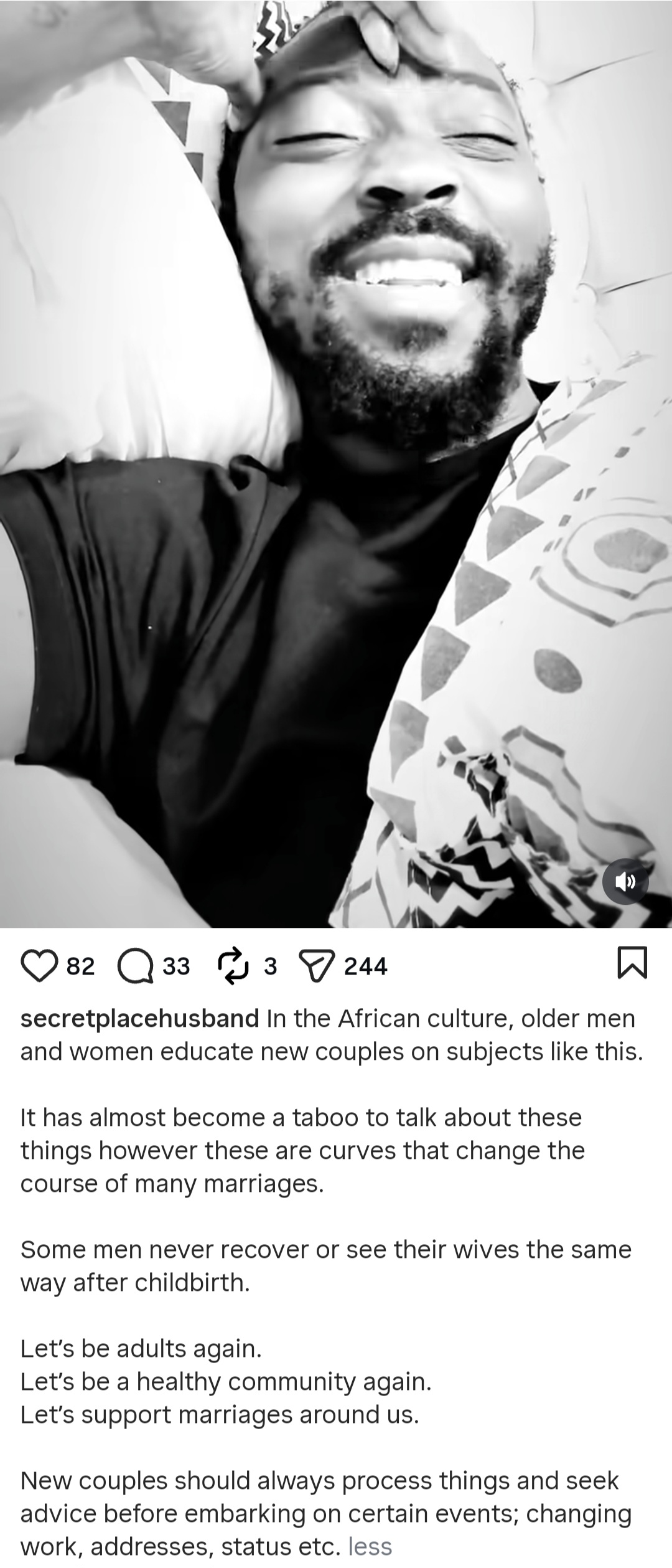 A man has said that having intercourse with his pregnant wife "traumatized" him and he added that men may not talk about it but they feel the same way. In a video shared online, the husband and father said no one talks about what married men have to go through when their wives are pregnant and following childbirth. Speaking about having intercourse with with pregnant wife, he said: "No one prepares you for that, no one. It was awkward." Speaking to single men about what married men face, he added: "You're going to become a man by finding pleasure in what is very displeasing but you have to act otherwise." In the caption, he wrote: "In the African culture, older men and women educate new couples on subjects like this. "It has almost become a taboo to talk about these things however these are curves that change the course of many marriages. "Some men never recover or see their wives the same way after childbirth. "Let's be adults again. Let's be a healthy community again. Let's support marriages around us. "New couples should always process things and seek advice before embarking on certain events; changing work, addresses, status, etc."