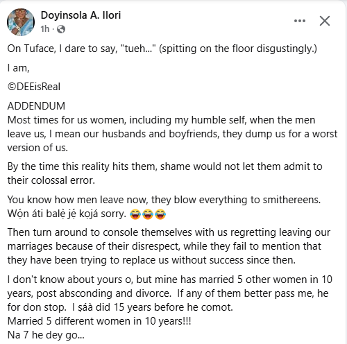 A 60-year-old Nigerian woman, Doyinsola A IIori, has revealed that her ex-husband has married five women in ten years since he absconded and later divorced her. The mother of four disclosed this in a Facebook post on Tuesday, December 2, while reacting to singer and his wife Natasha's altercation. Doyinsola had earlier recalled the time she decided to leave her marriage due to constant disputes and infidelity but had to jettison the plans and instead stayed in a loveless relationship for the sake of her children. However, when her husband decided to leave their marriage, he did so without considering how the decision would affect their family. According to her, she told him to consider how the divorce would affect their children. He simply told their children that his joy is more important than them and walked away. On Tuface, I dare to say, tueh... Most times for us women, including my humble self, when the men leave us, I mean our husbands and boyfriends, they dump us for the worst version of us, she wrote. "By the time this reality hits them, shame would not let them admit to their colossal error. You know how men leave now, they blow everything to smithereens. Wn ti bal j kj sorry Then they turn around to console themselves with us regretting leaving our marriages because of their disrespect, while they fail to mention that they have been trying to replace us without success since then. I don't know about yours o, but mine has married 5 other women in 10 years, post absconding and divorce. If any of them better pass me, he for don stop. I did 15 years before he comot. Married 5 different women in 10 years!!! Na 7 he dey go. (Kay, Oya k bet with me.) The 7 sef, na him children I pity, otherwise, he for change wife till he kpai at any age ni. PS: Tuface dey kraze, he no well. Na laff Annie suppose dey laff him family now. Sebi na she, dem say she no good, and dem no like. Make dem dey manage Natasha now n. Na so I laff my ex husbands family, when only two years after he married that d3ad lady, they started chanting, gb Iya Bb gan o le t'eyii.