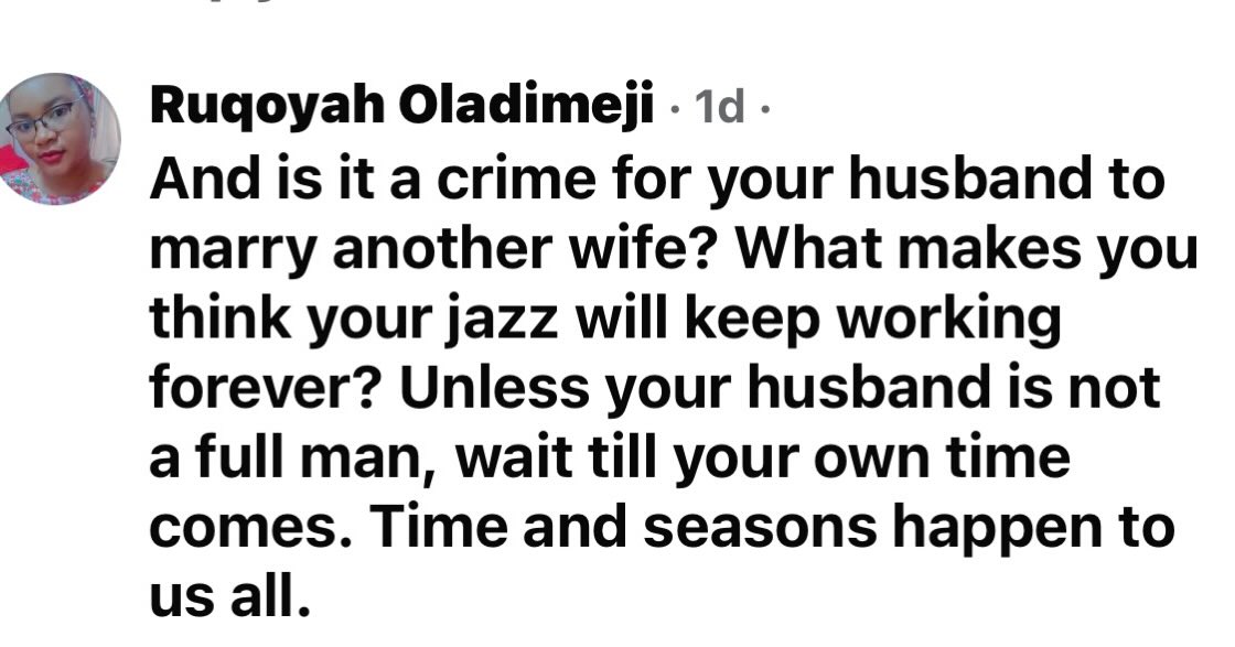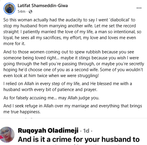 A Nigerian mother of four, Latifat Shamseddin Giwa, has reacted after a lady accused her of going diabolical in order to stop her husband from taking a second wife simply because she is married to a man who loves her immensely and appreciates all her sacrifices. In the screenshot she shared on Facebook, the lady, Ruqoyah Oladimeji, wrote: And is it a crime for your husband to marry another wife? What makes you think your jazz will keep working forever? Unless your husband is not a full man, wait till your own time comes. Time and seasons happen to us all. Latifat, who married her husband when they were still struggling, said most of the women constantly attacking her wouldn't have taken a second look at him then. So this woman actually had the audacity to say I went diabolical to stop my husband from marrying another wife. Let me set the record straight: I patiently married the love of my life, a man so intentional, so loyal, he sees all my sacrifices, my effort, my love and loves me even more for it, she wrote in the Facebook post on Tuesday, December 23. "And to those women coming out to spew rubbish because you see someone being loved right maybe it stings because you wish I were going through the hell youre passing through, or maybe youre secretly hoping hed choose one of you as a second wife. Some of you wouldnt even look at him twice when we were struggling! "I relied on Allah in every step of my life, and He blessed me with a husband worth every bit of patience and prayer. As for falsely accusing me may Allah judge you. And I seek refuge in Allah over my marriage and everything that brings me true happiness."