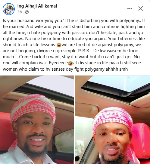 A Ghanaian polygamist, Alhaji Ali Kamal, has advised women who constantly fight their husbands for taking second wives to either accept the situation or leave the marriage. In a Facebook post on Wednesday, Kamal, who has two wives, said none has the time to educate women who hate polygamy. Is your husband worrying you? If he is disturbing you with polygamy.. If he married 2nd wife and you can't stand him and continue fighting him all the time, u hate polygamy with passion, don't hesitate, pack and go right now.. No one hv ur time to educate you again.. Your bitterness life should teach u life lessons, we are tired of de against polygamy, we are not begging, divorce n go simple ... De kwasiasem be tooo much.... Come back if u want, stay if u want but if u can't, just go.. No one will complain wai.. Byeeeeee. At dis stage in life paaa h still see women who claim to hv senses dey fight polygamy ahhhh smh, he wrote.